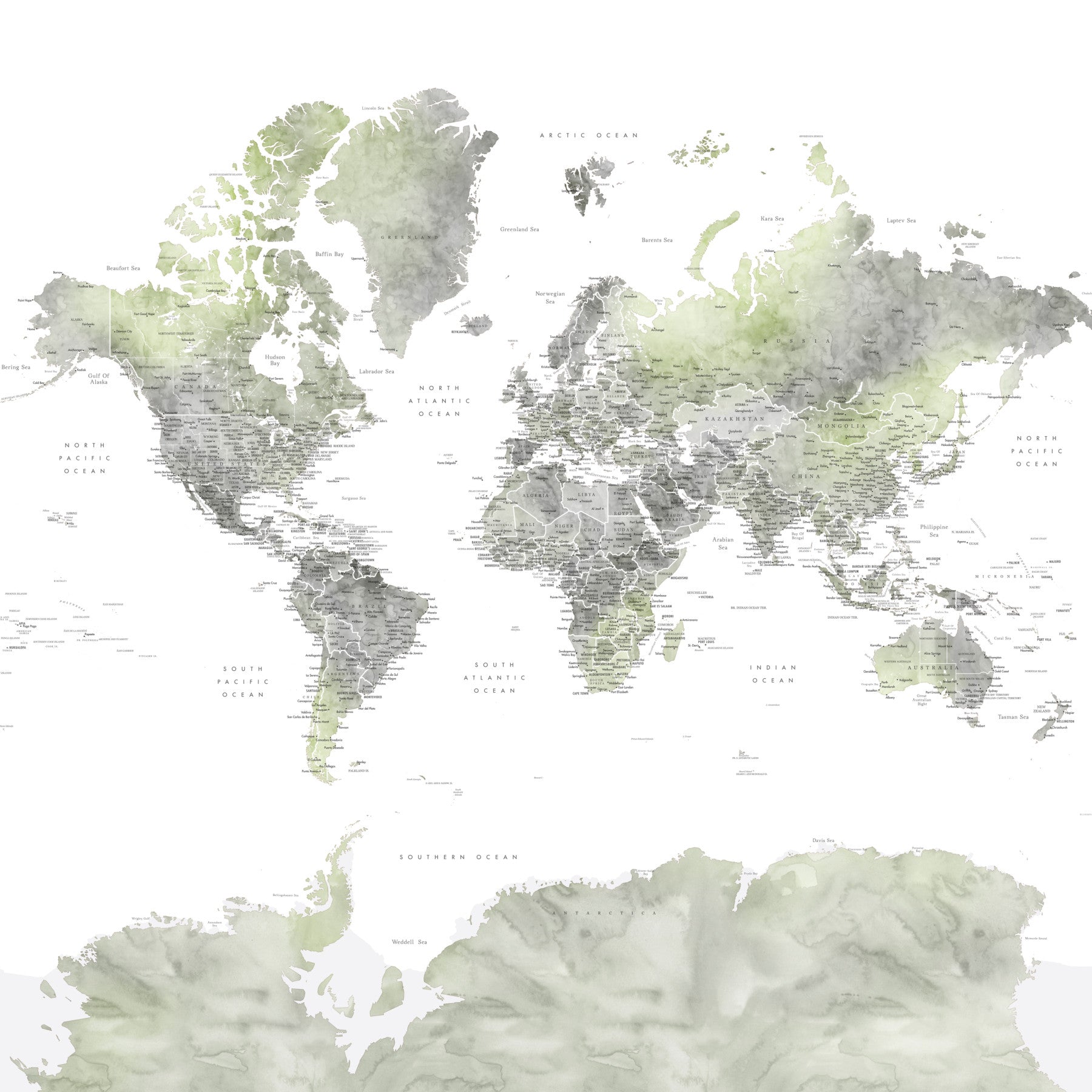 Embrace the beauty of global exploration with this stunning watercolor world map. The wallpaper showcases a detailed map rendered in elegant shades of green and grey, creating a calming and sophisticated atmosphere. The watercolor technique adds a soft texture, transforming the map into a work of art that inspires wanderlust and encourages exploration. Its subtle color palette makes it a versatile piece suitable for various interior styles and room types. Whether adorning a study, bedroom, or office, this wallpaper invites viewers to dream of faraway lands and exciting adventures.