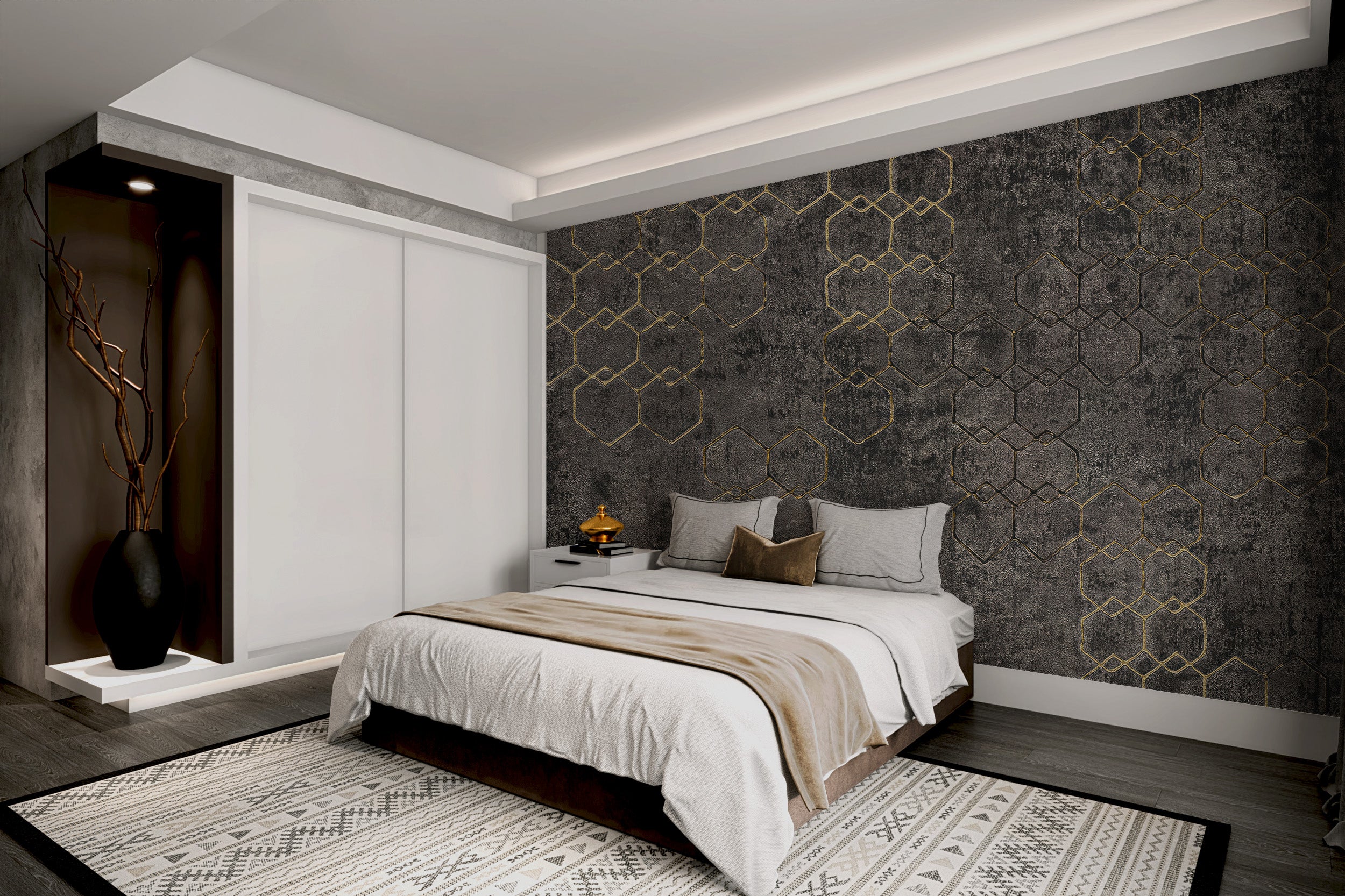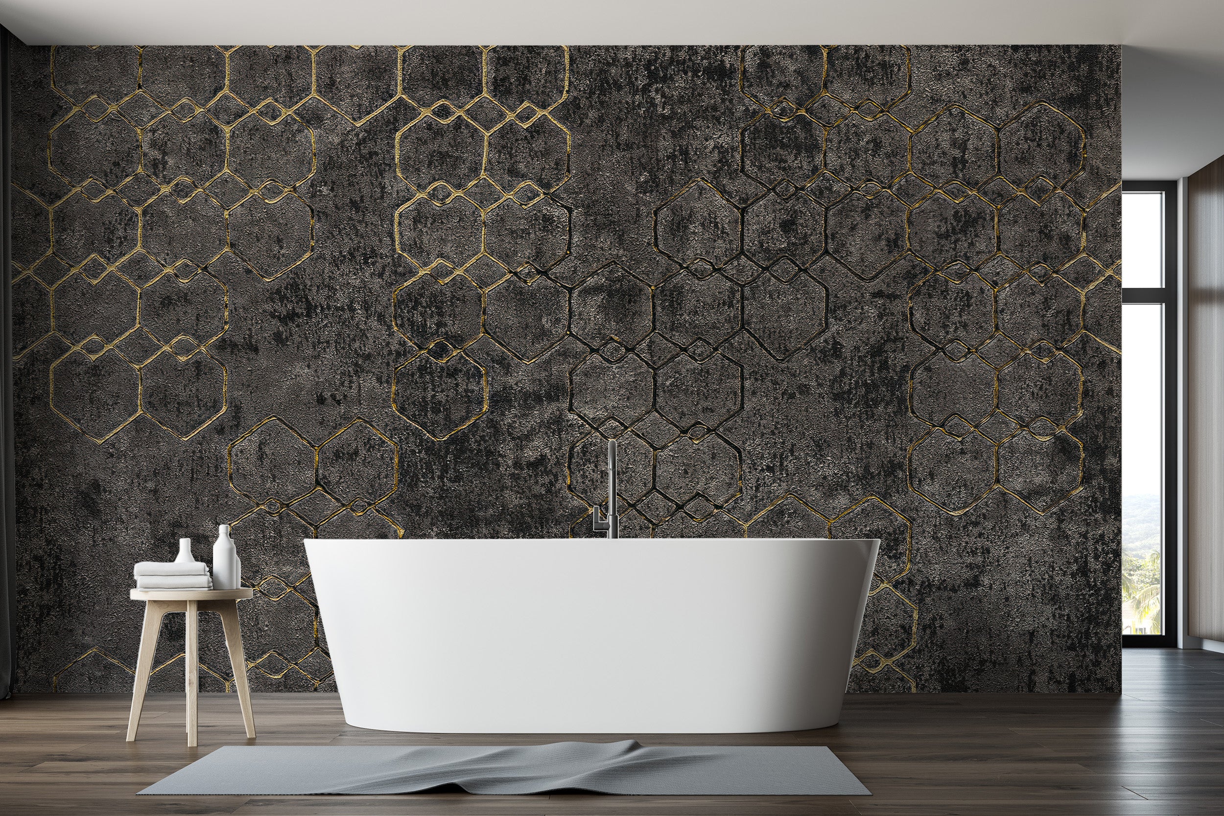 Transform your space with the gold hexagon luxury geometric wallpaper, a perfect blend of modern geometric wallpaper and industrial elegance. The black and gold geometric wallpaper design features intricate hexagonal patterns with a distressed concrete texture, adding depth and sophistication. Ideal for accent walls, living rooms, or office spaces, this luxury geometric wallpaper enhances any interior with a bold statement. The rich gold accents create a striking contrast, making it a stylish choice for contemporary décor. Elevate your home with this geometric hexagon wallpaper, bringing a refined, high-end aesthetic that captivates and inspires. Easy to install and durable for lasting beauty.
