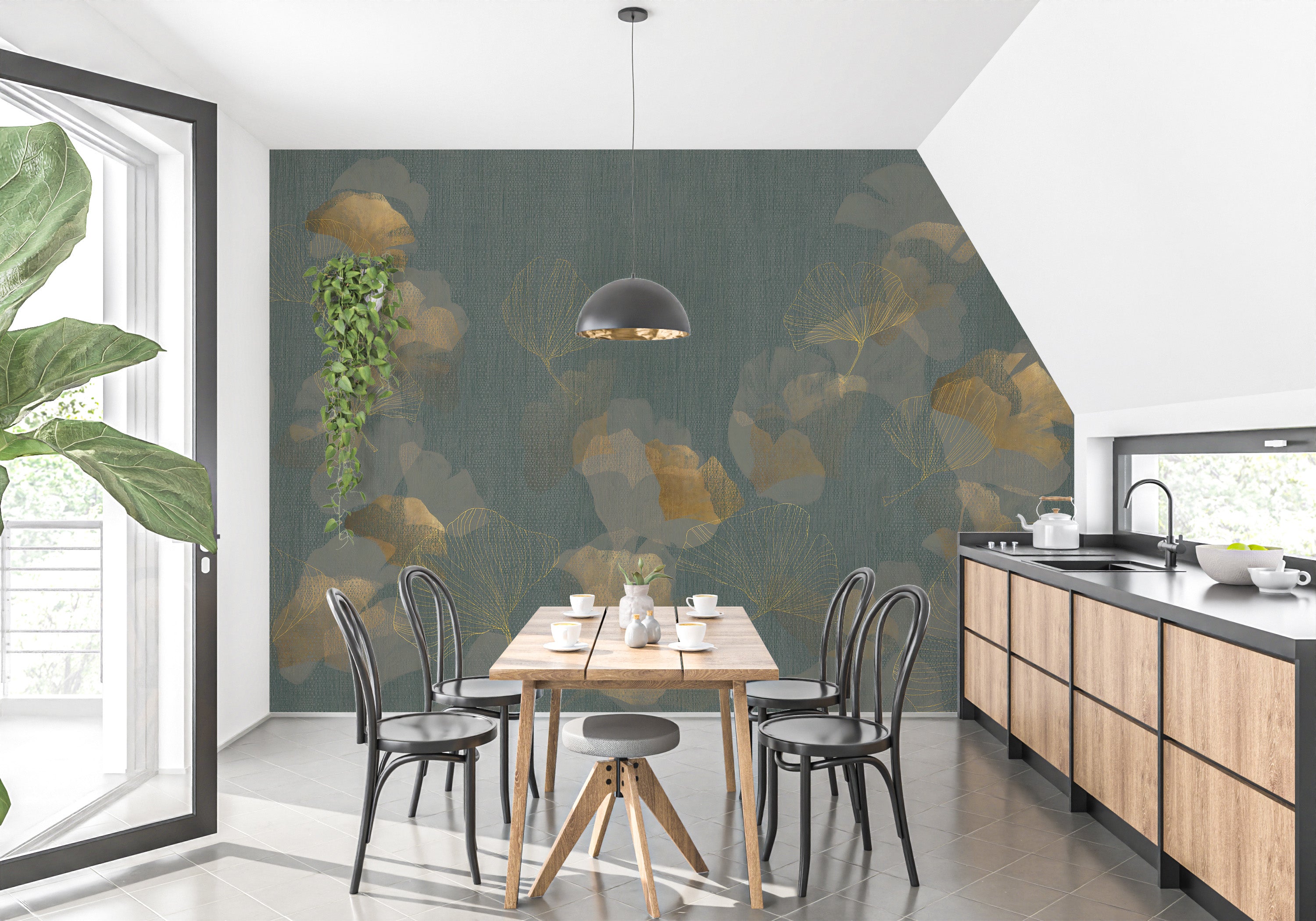 Contemporary wallpaper mural featuring golden leaf details