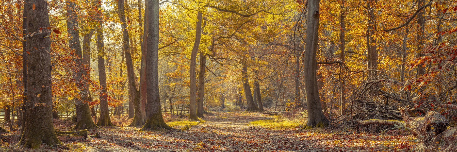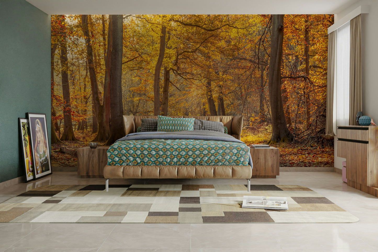 Pathway through Autumn forest. Bring the warmth of autumn indoors with this stunning forest path scene. Sunlight streams through golden leaves, casting a radiant glow on the landscape. The detailed textures of bark and fallen leaves create a natural, immersive effect. This wallpaper for walls is ideal for a living room, bedroom, or entryway, lending a touch of organic beauty and tranquility to your space. Its warm colours and inviting composition complement both modern and rustic interiors.
