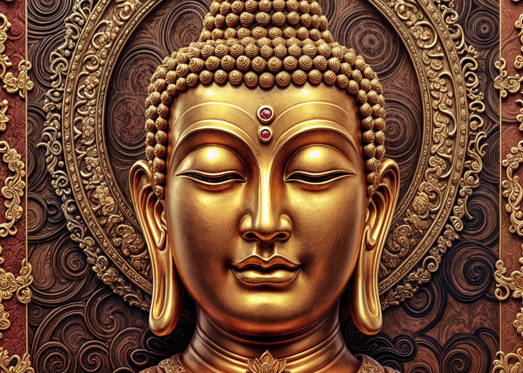 Invite tranquility with this stunning Golden Buddha wallpaper. The intricate detailing and rich golden tones create a luxurious and calming atmosphere. Three ruby stones adorn the forehead. With its complex circle, It's suitable for walls in meditation rooms, living rooms, or even bedrooms, bringing a sense of peace and serenity. This wallpaper for walls enhances interiors with its spiritual elegance and refined aesthetic, creating a sanctuary within your home.