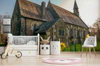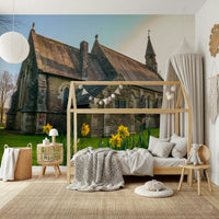 Easter Daffodils. Elevate the look of your interiors with this design. It shows a stately stone church, softened by golden daffodils. The colour palette features yellow, brown, and green. This photograph provides a serene mood to any room. As wallpaper for walls, this design is well-suited for a dining room, living room, or entry. It complements interiors seeking a balance of architectural interest with a natural touch. The image makes a stunning statement, creating a tranquil backdrop.