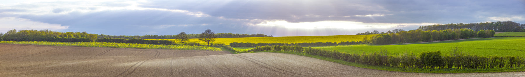 Panoramic view of fields in Hampshire during spring. Imagine waking up to the serene beauty of a sun-drenched landscape. This wallpaper showcases golden fields and verdant pastures, capturing a moment of rural tranquility. The contrasting textures and light create a dynamic yet calming effect. Ideal as wallpaper for walls in a bedroom, study, or dining room, the design enhances interiors with a touch of understated elegance. Its broad view expands a space and brings the outdoors in.
