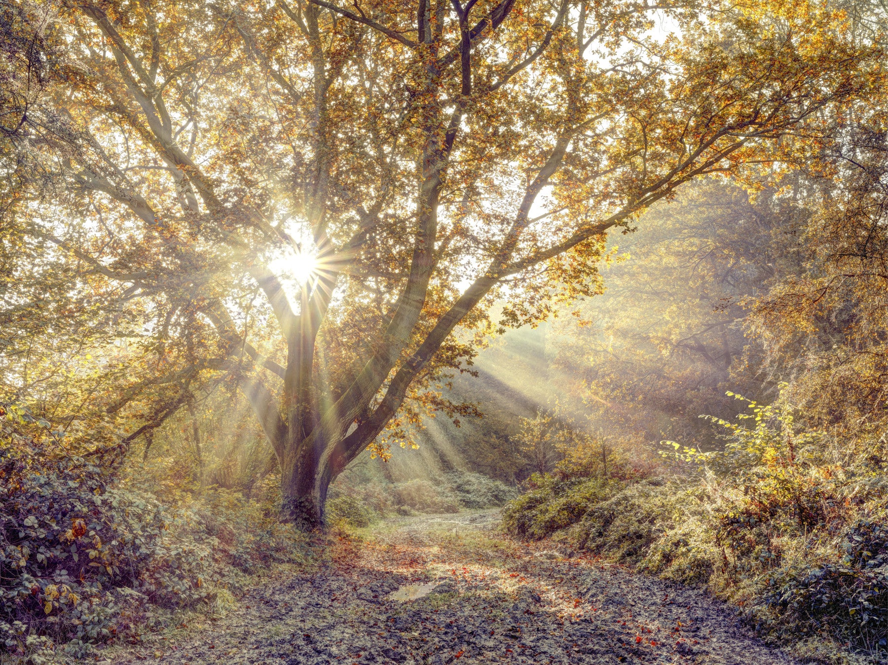 Sun Rays through tree in autumn forest. Bathe your walls in the warmth of a golden forest. This design captures the magic of sunlight streaming through autumn trees. Earthy browns and radiant yellows create a peaceful atmosphere. This wallpaper for walls makes a wonderful feature in a living room or bedroom. The natural theme complements rustic or minimalist interiors and brings the serene beauty of nature indoors. The radiant light adds brightness to any space, creating a calming and inviting environment.