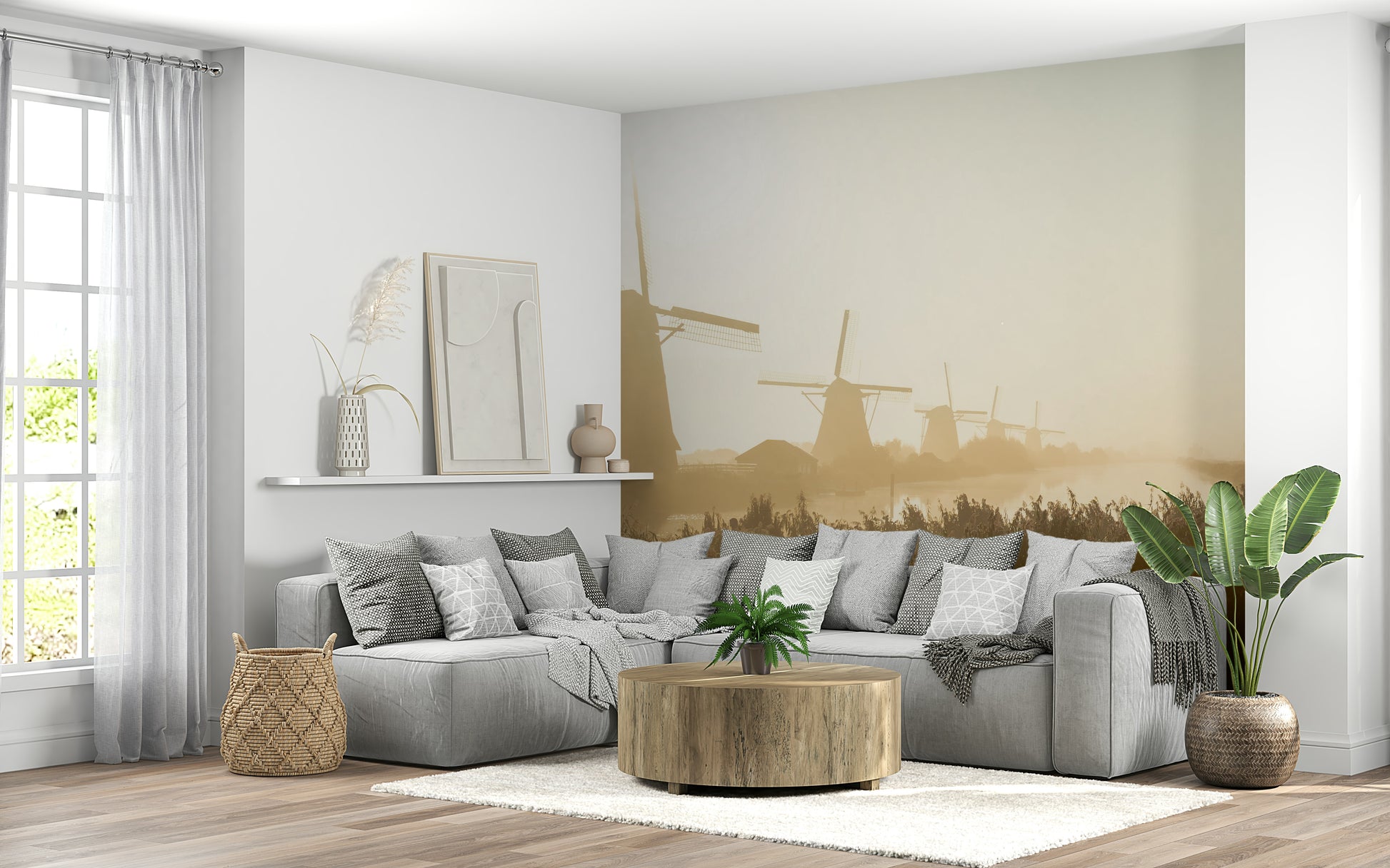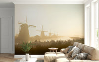 Invite tranquil scenery inside with this wallpaper for walls. It features iconic Dutch windmills silhouetted against a glowing, hazy sunrise. The warm gold and beige tones create a calming effect, perfect for a bedroom or living room. Imagine this peaceful scene transforming your space into a serene retreat. This design evokes a sense of quiet beauty and complements minimalist or rustic interiors, adding a touch of timeless charm.
