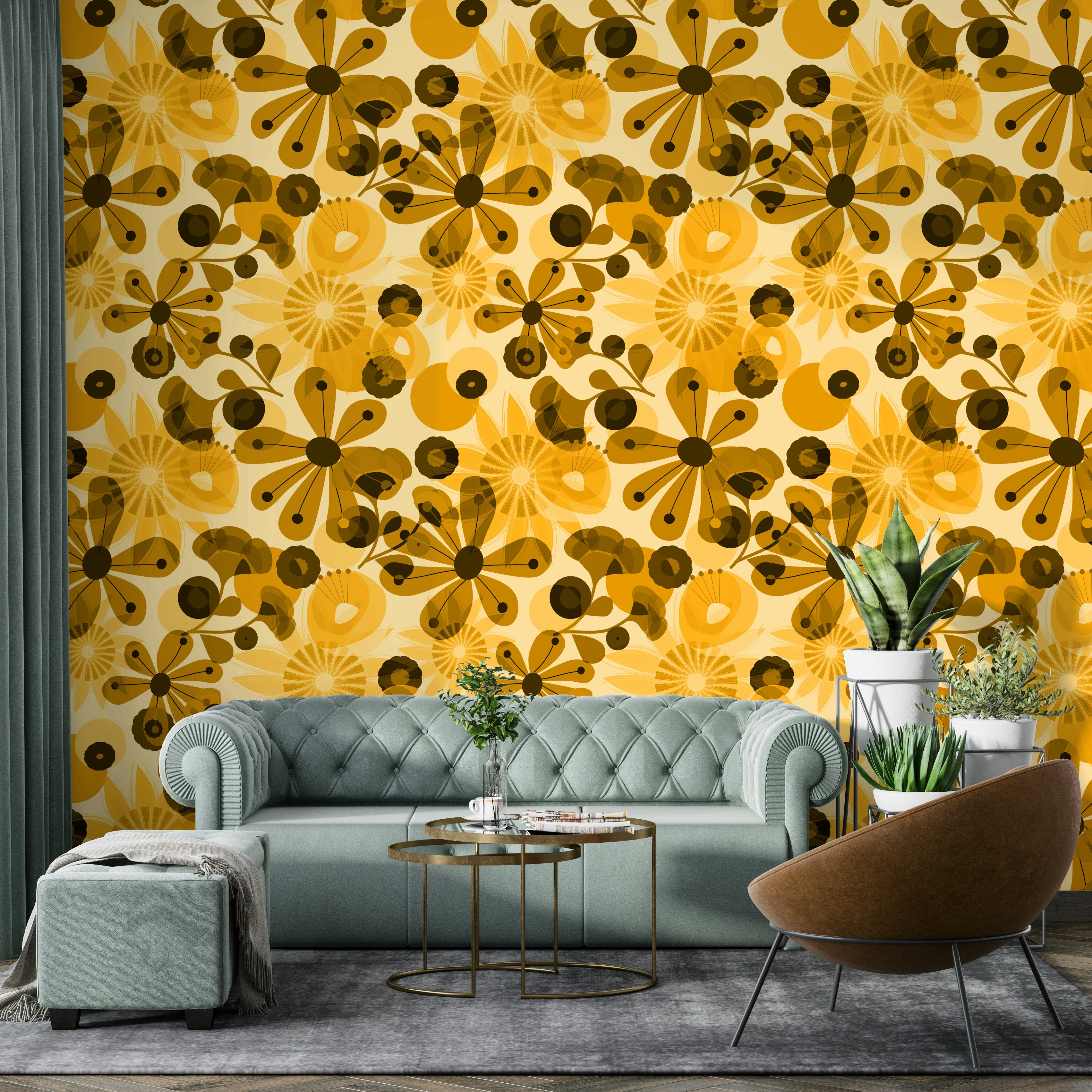 Bathed in warm, golden hues, this wallpaper evokes a feeling of serene tranquility. Overlapping layers of abstract floral forms create a sense of depth and movement, reminiscent of a sun-drenched garden. The interplay of light and shadow within the stylized flowers adds a touch of mystery and sophistication. The muted yellow and brown palette lends itself to a calming and sophisticated aesthetic, ideal for creating a relaxing atmosphere in any room. Perfect for adding a touch of modern elegance to your living space without being overly bold or overpowering.