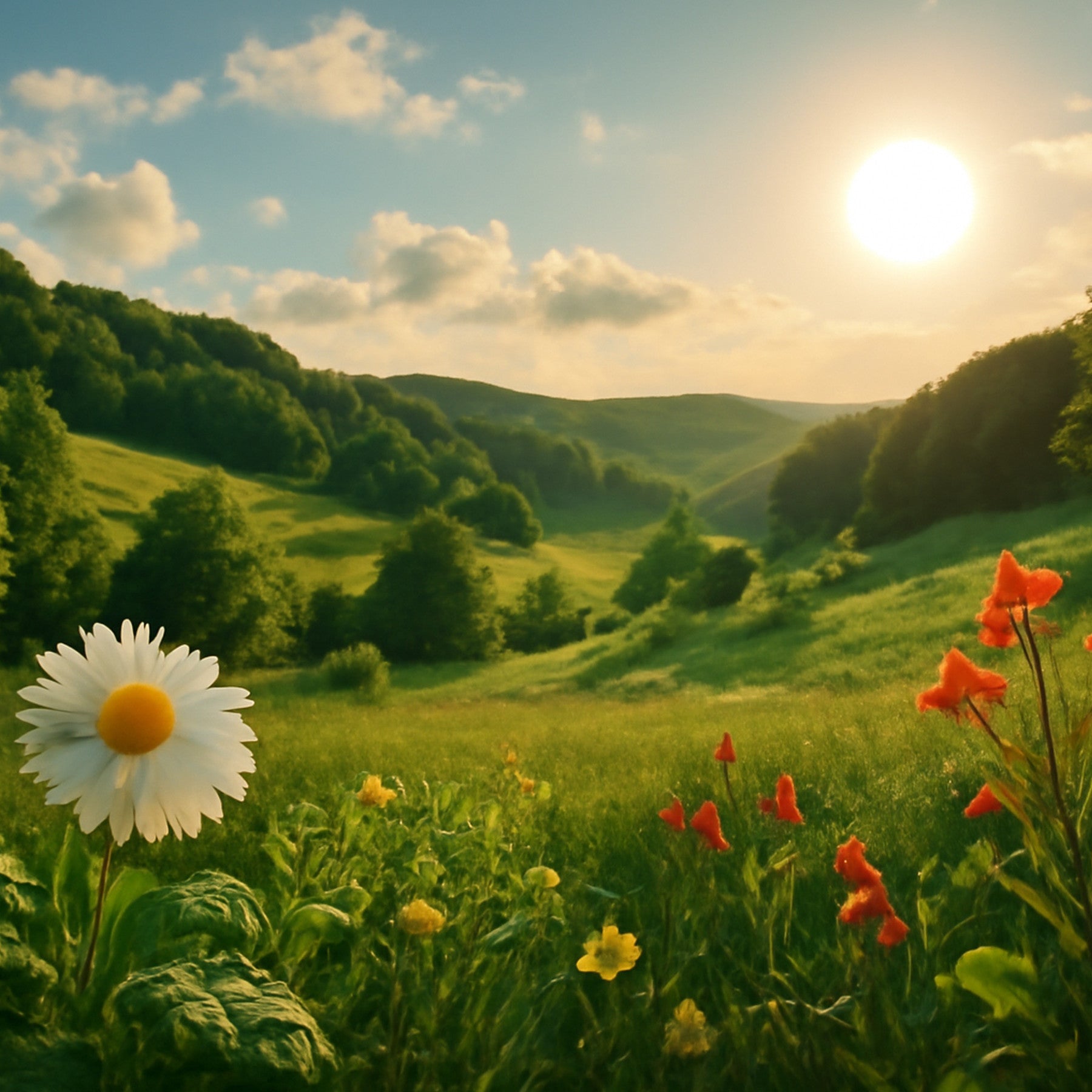 Transform your space with this breathtaking wallpaper for walls. The scene showcases a daisy flower in a meadow landscape, bathed in the warm glow of the golden hour. Imagine rolling hills, lush green grass, and a sun-kissed sky. The artwork balances tranquility and vibrancy. The wallpaper offers a captivating display of nature's artistry. Ideal for bedrooms, living rooms, or offices, the design will open up spaces, adding an element of peace and relaxation to your décor.