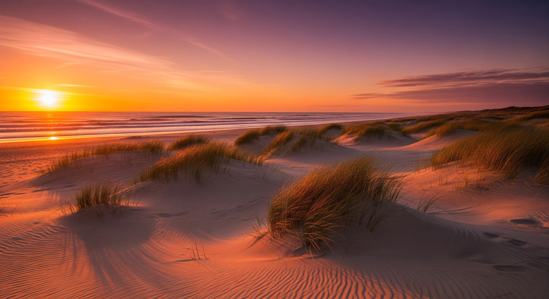 Transform your living space with this captivating landscape, a stunning choice for wallpaper for walls. The rich colours create an inviting atmosphere, perfect for a bedroom or living room. This wallpaper features rolling sand dunes bathed in the warm glow of the setting sun, offering an image that feels both grand and comforting. The golden light enhances the texture of the sand, bringing a tactile dimension to your decor. Install this wallpaper in your home and make it feel like a serene retreat. It will beautifully complement spaces designed for relaxation, enhancing interior spaces.