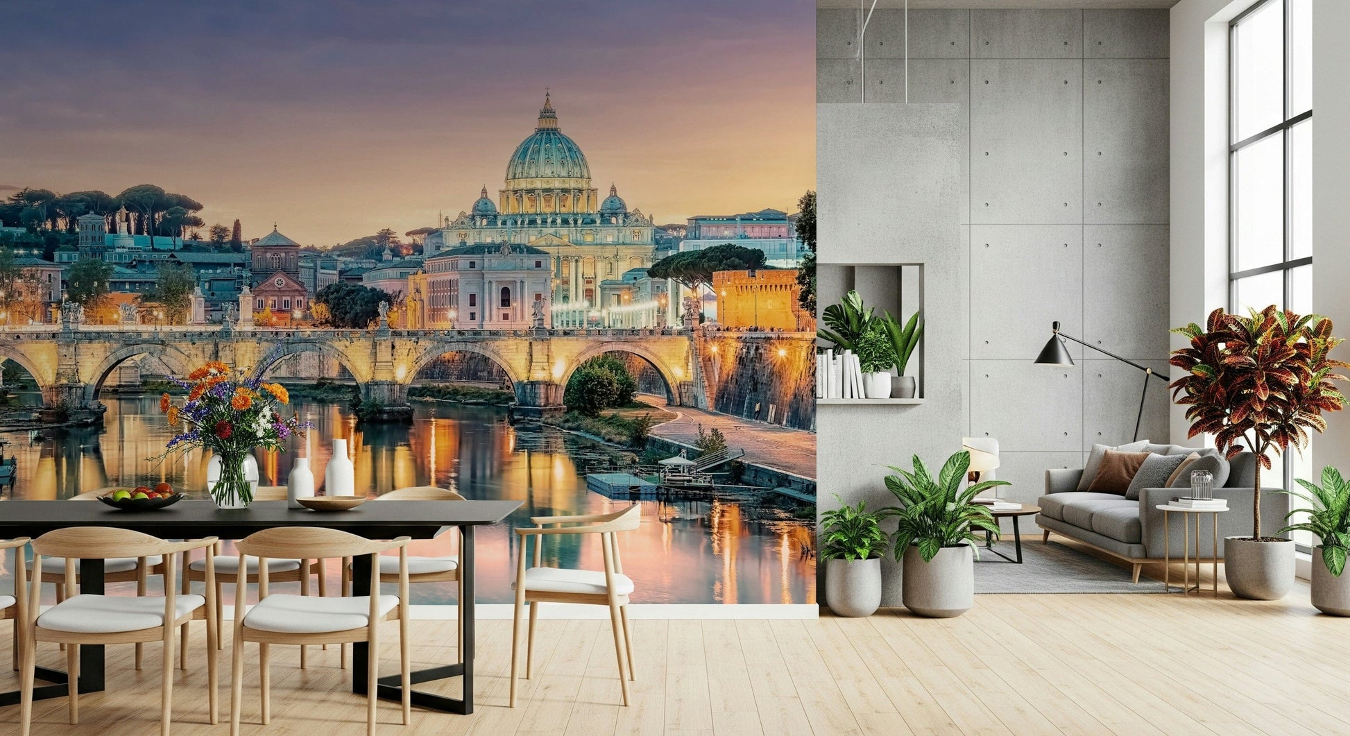 Bathe your space in the radiant warmth of 'Golden Hour in Rome'. This piece captures the timeless beauty of the Eternal City as the setting sun casts its amber glow upon the iconic St Peter's Basilica and the historic Ponte Sant'Angelo. The tranquil waters of the Tiber River mirror the architectural grandeur and the soft hues of the sky, creating a mesmerising symphony of light and shadow. The illuminated bridge, lined with statues, evokes a sense of history and artistry. Add a touch of romantic Italian charm to your home with this serene vista, turning any room into a tranquil escape reminiscent of a Roman sunset. Let this sophisticated scene imbue your surroundings with the elegance and allure of Rome, transforming your walls into a captivating work of art.