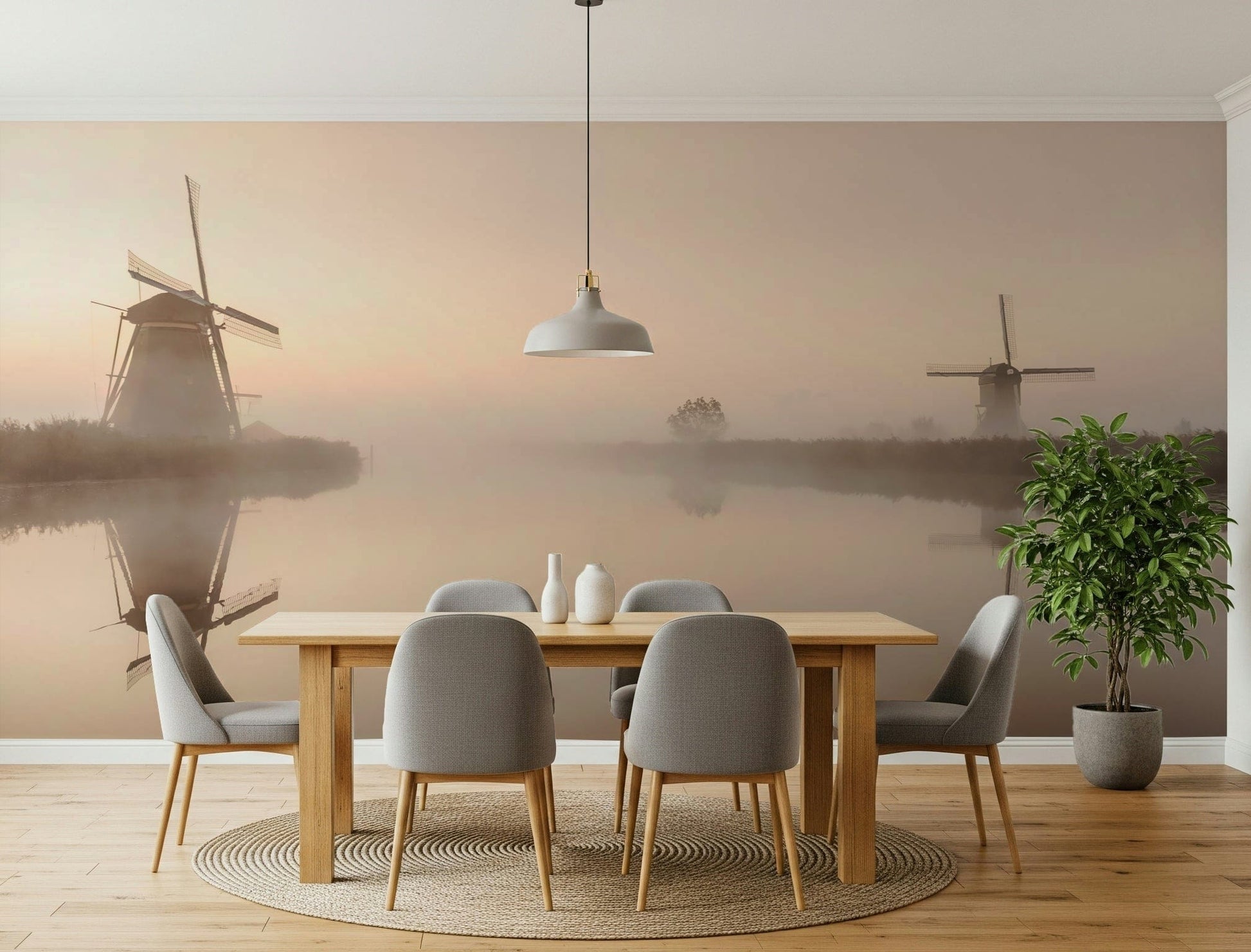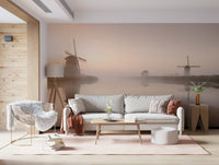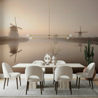 Immerse yourself in the tranquil beauty of 'Golden Hour Windmills'. This stunning wallpaper captures the serene ambiance of a misty dawn, where the soft, golden light bathes the landscape in a warm, ethereal glow. Two iconic windmills stand silhouetted against the hazy sky, their reflections mirrored perfectly in the calm waters below. The scene evokes a sense of peace and nostalgia, transporting you to a simpler time. The muted colour palette, dominated by shades of gold, beige, and brown, creates a calming effect, perfect for adding a touch of rustic charm to your digital space. Let this picturesque scene transform your screen into a window overlooking the timeless beauty of the Dutch countryside, offering a moment of serenity with every glance. This image is a perfect blend of nature, architecture, and artistry.