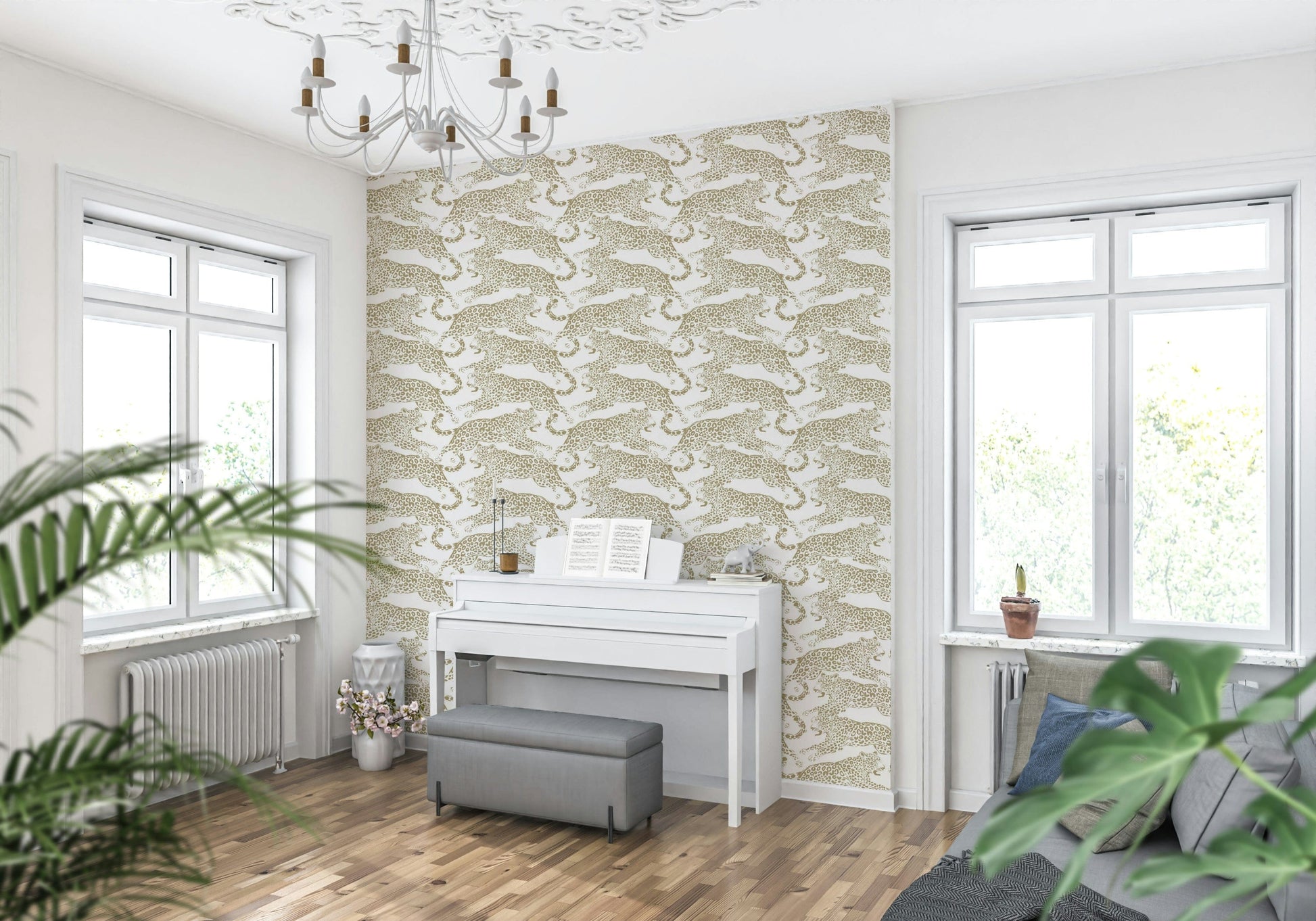 Bold golden leopard print wall covering adding a stylish, exotic touch to rooms.