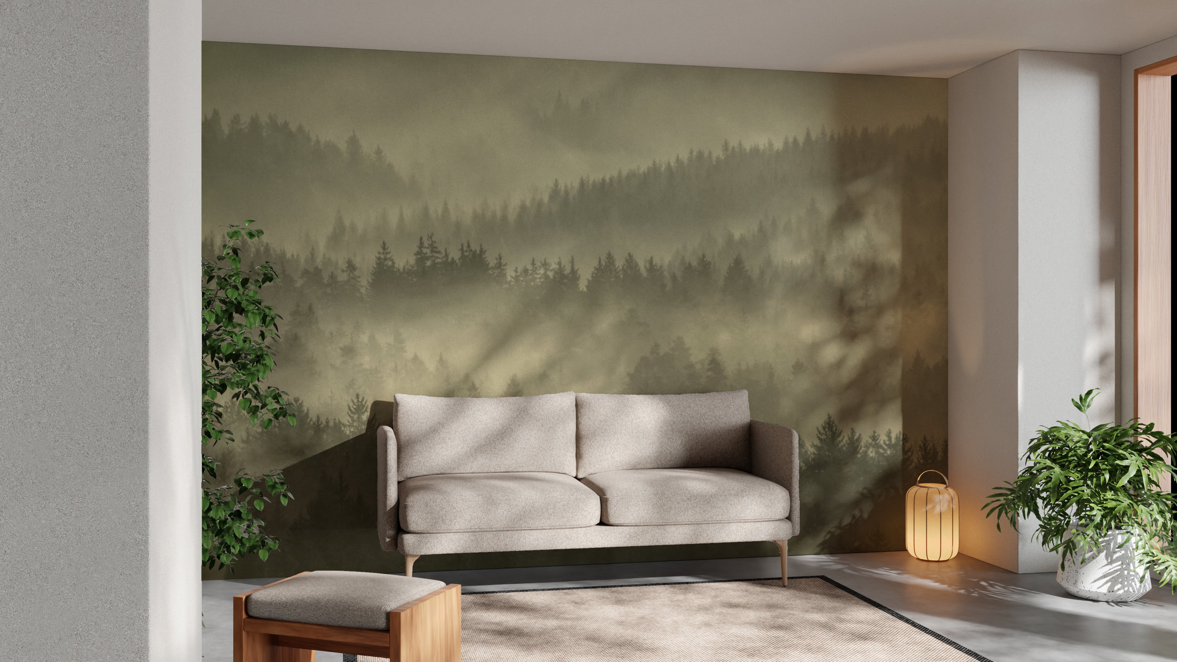 Bring the calm beauty of nature to your walls with golden, misty forest wallpaper. Featuring layers of fog drifting through pine trees, this misty forest wallpaper creates a peaceful and natural atmosphere. The soft golden light paired with muted greens makes this foggy pine tree mural ideal for rustic, minimalist, or modern interiors. Perfect for living rooms, bedrooms, or offices, this nature-inspired forest wallpaper adds depth and character to any space. The serene forest landscape wallpaper highlights natural textures, while the earth-tone forest wallpaper brings warmth and elegance to your home.