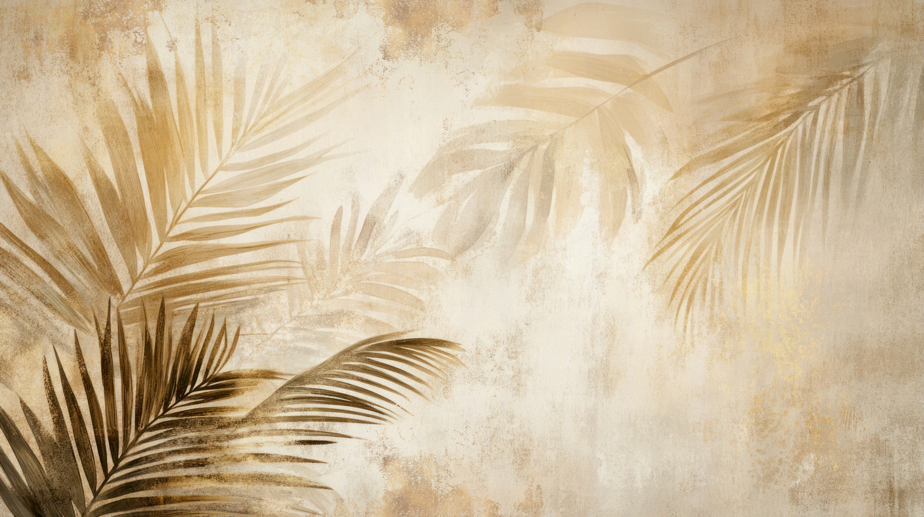 A neutral artistic wallpaper with golden palm leaves creating a soft, dreamy tropical effect.