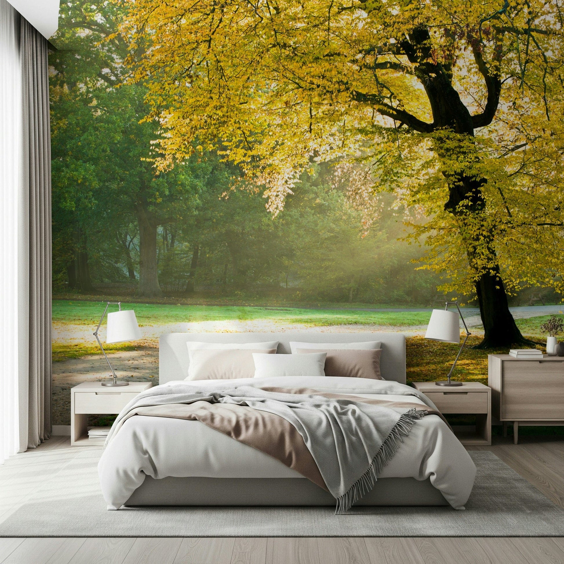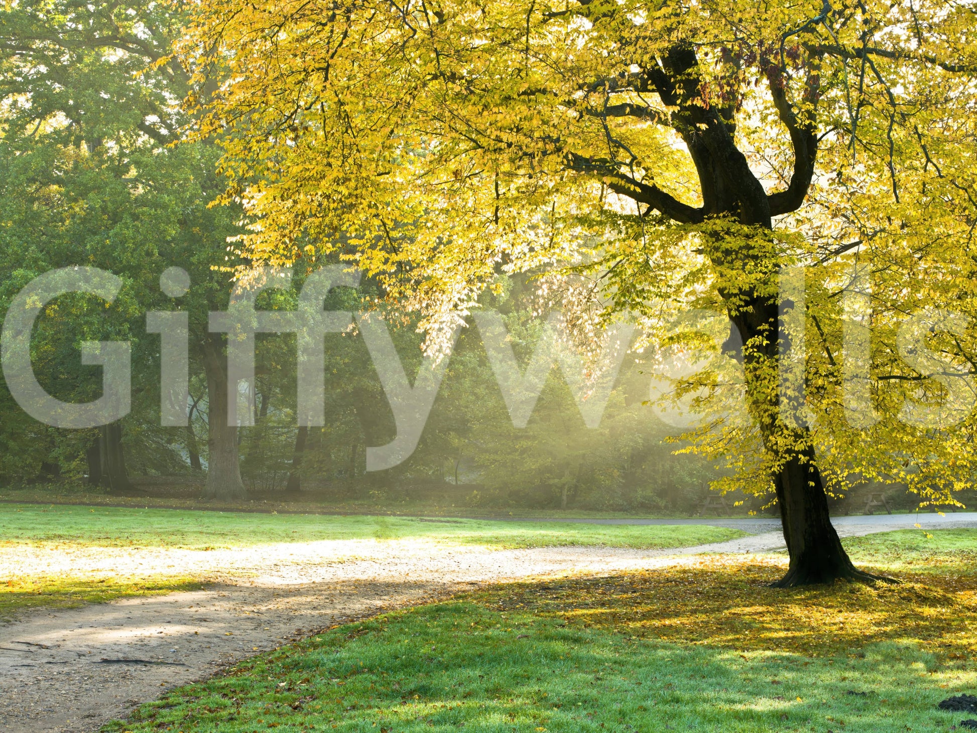 Autumn tree in sunlight. Immerse yourself in the warm embrace of "Golden Radiance," a captivating piece of wall décor that evokes the serene beauty of an autumn morning. This artwork showcases a majestic tree, its canopy ablaze with leaves painted in hues of brilliant gold, radiating a soft, ethereal light. The sunlight filters through the foliage, creating a mesmerising dance of light and shadow on the lush green meadow below. A tranquil path winds its way through the landscape, inviting you to step into this peaceful sanctuary. "Golden Radiance" brings a sense of warmth, tranquility, and natural beauty to any room. Elevate your living space with this radiant vista, capturing the essence of autumn's fleeting, golden moments, infusing your surroundings with a sense of serenity and natural splendour.