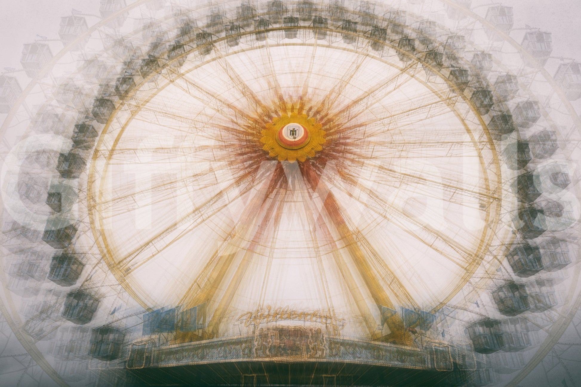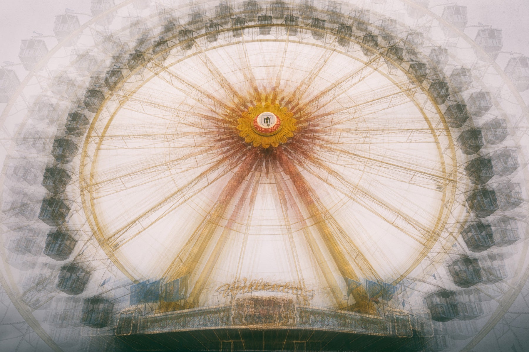 Experience the mesmerizing allure of "Golden Ride", a stunning wallpaper capturing the ethereal beauty of a Ferris wheel in motion. This captivating image evokes a sense of nostalgia and wonder, transforming your digital space into a vibrant carnival dreamscape. The golden hues that envelop the structure, combined with a soft-focus effect, create a dreamy and almost otherworldly atmosphere. The movement is palpable, suggesting a continuous, gentle rotation that pulls you into its hypnotic rhythm. Delicate details of the cabins peek through the blur, adding depth and complexity to the composition. This wallpaper is perfect for those seeking a touch of whimsy, adventure, and a golden glow to brighten their everyday digital interactions. Let "Golden Ride" take you on a visual journey, transporting you to a world of endless possibilities and joyful spins.