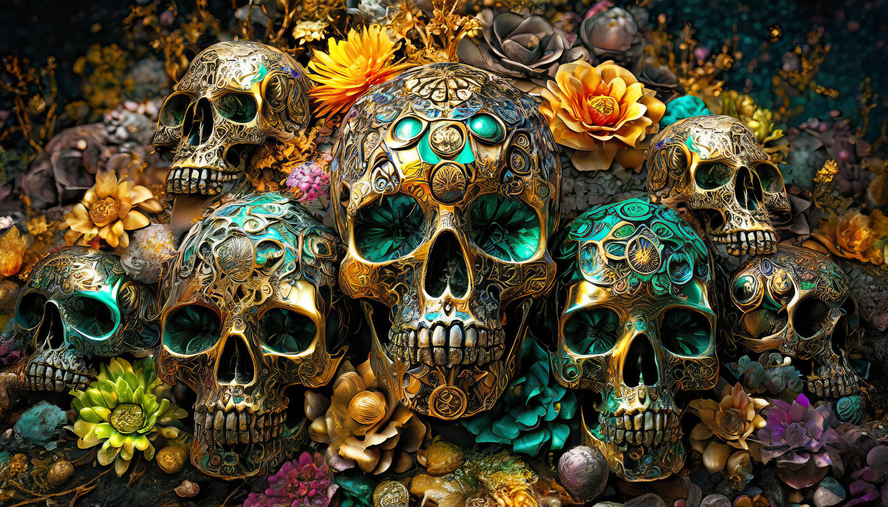 A lavish arrangement where ornate golden skulls meet the vibrant beauty of nature. The contrasting elements create a macabre yet luxurious ambiance. Skulls are intricately detailed with swirling patterns and embellishments, giving the design a touch of opulence. Teal, gold and yellows are the featured colors, the flowers blooming amidst the skulls, adding an element of ethereal contrast. This wallpaper is perfect for anyone seeking a dramatic and edgy look, with a blend of classic and alternative styles.