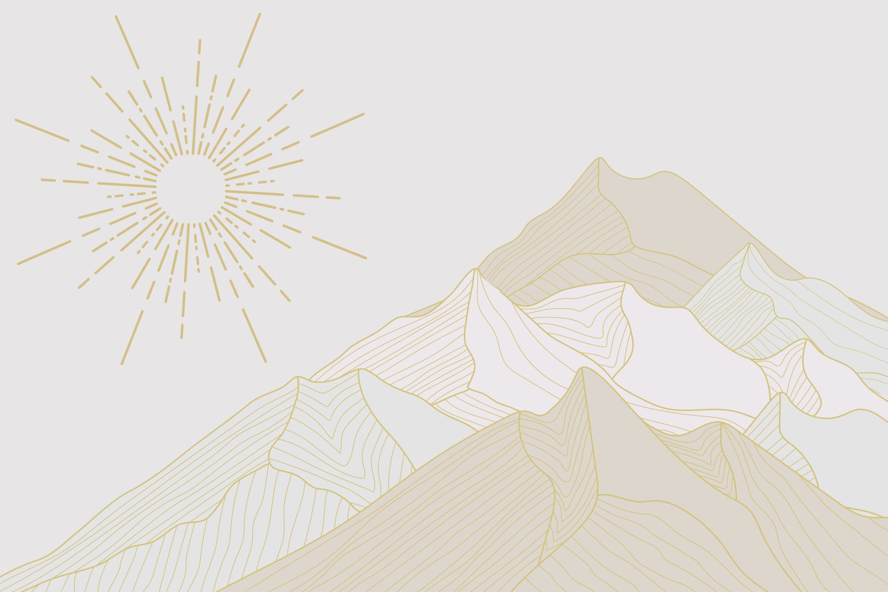 Bring a sense of calm into your home with this simple mountain range wallpaper. Golden lines create peaks against a soft beige backdrop. The radiant sun adds a touch of warmth. This design uses simple lines and elegant shapes. This wallpaper for walls enhances any space. It suits bedrooms, offices, or even dining rooms, adding subtle sophistication. The neutral tones create a relaxing atmosphere, perfect for modern interiors.