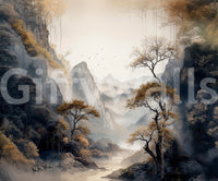 Invite tranquility indoors with this scenic wallpaper for walls. It presents a calming valley landscape, where golden-toned trees meet misty mountains. The soft colour palette, featuring beige, grey, and hints of gold, adds warmth to any room. This design transforms bedrooms and living rooms into peaceful retreats. The artful composition makes it a sophisticated choice that complements minimalist and rustic interiors.