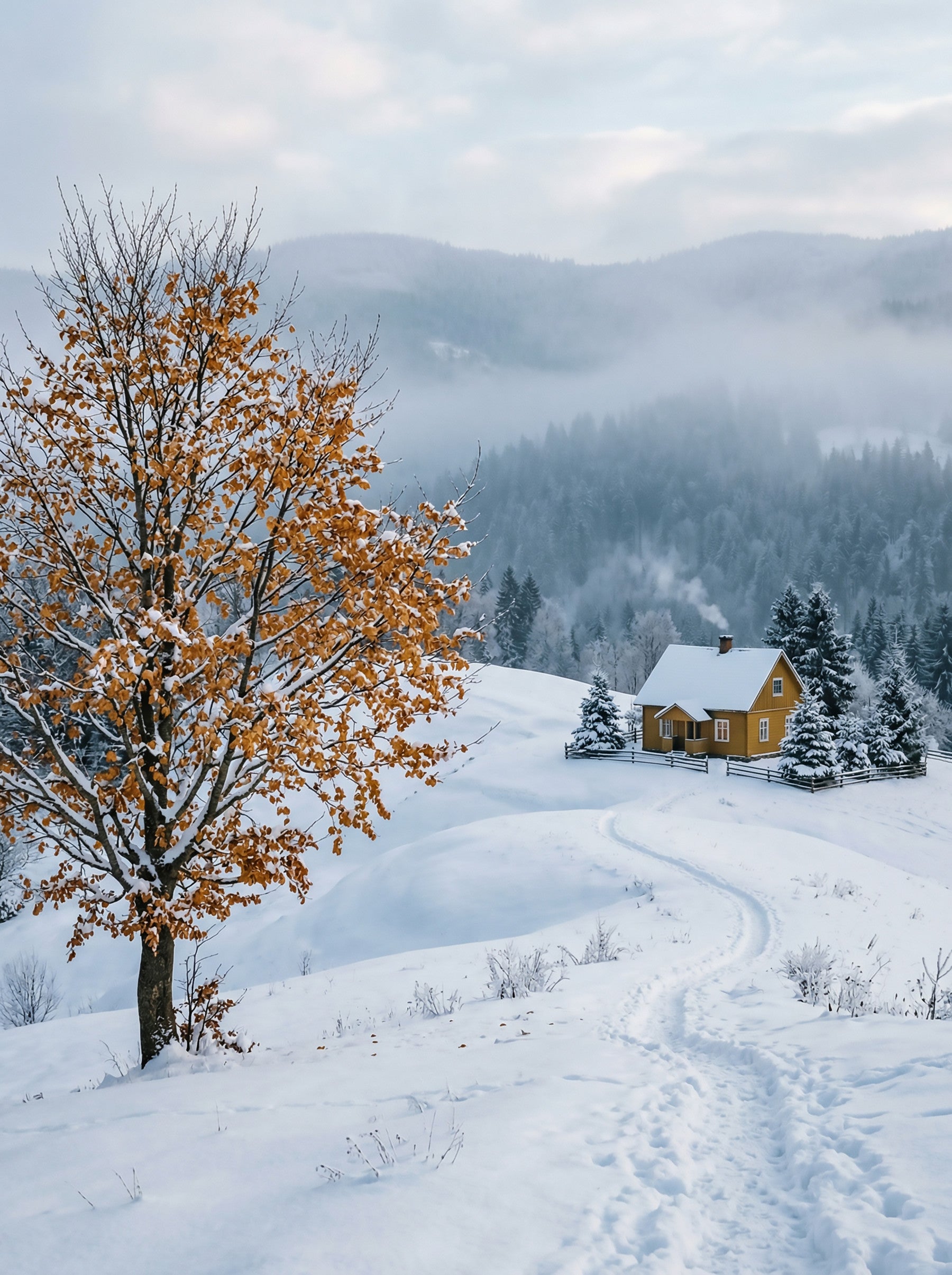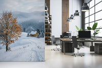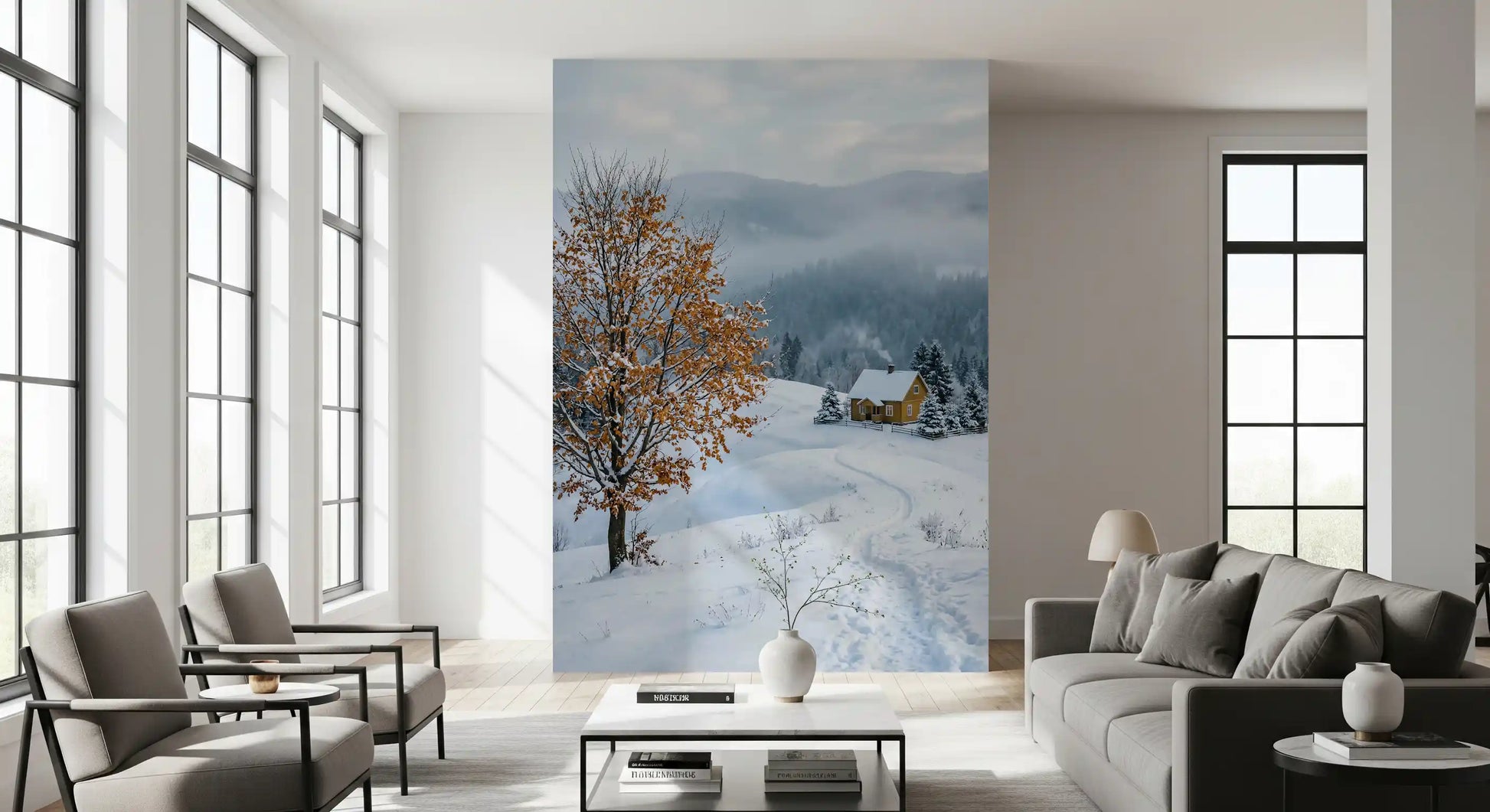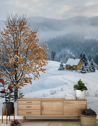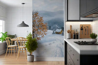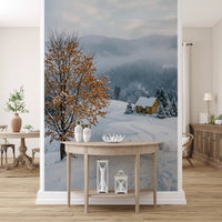 This captivating wallpaper mural transforms any room into a serene winter escape. It features a picturesque landscape blanketed in fresh snow, with gentle rolling hills leading to a charming yellow house. Smoke gently rises from the chimney, adding a touch of cosy warmth to the cool scene. A striking golden-leaved tree, partially covered in snow, stands vibrantly in the foreground, creating a beautiful contrast. The colour palette blends crisp whites and soft blues of the snowy hills and misty mountains with the inviting yellows and oranges of the house and tree. This design brings a peaceful and tranquil ambience to living rooms, bedrooms, or even a quiet home office. It enhances interior spaces by creating an immediate sense of calm and a comforting connection to nature's quiet beauty.