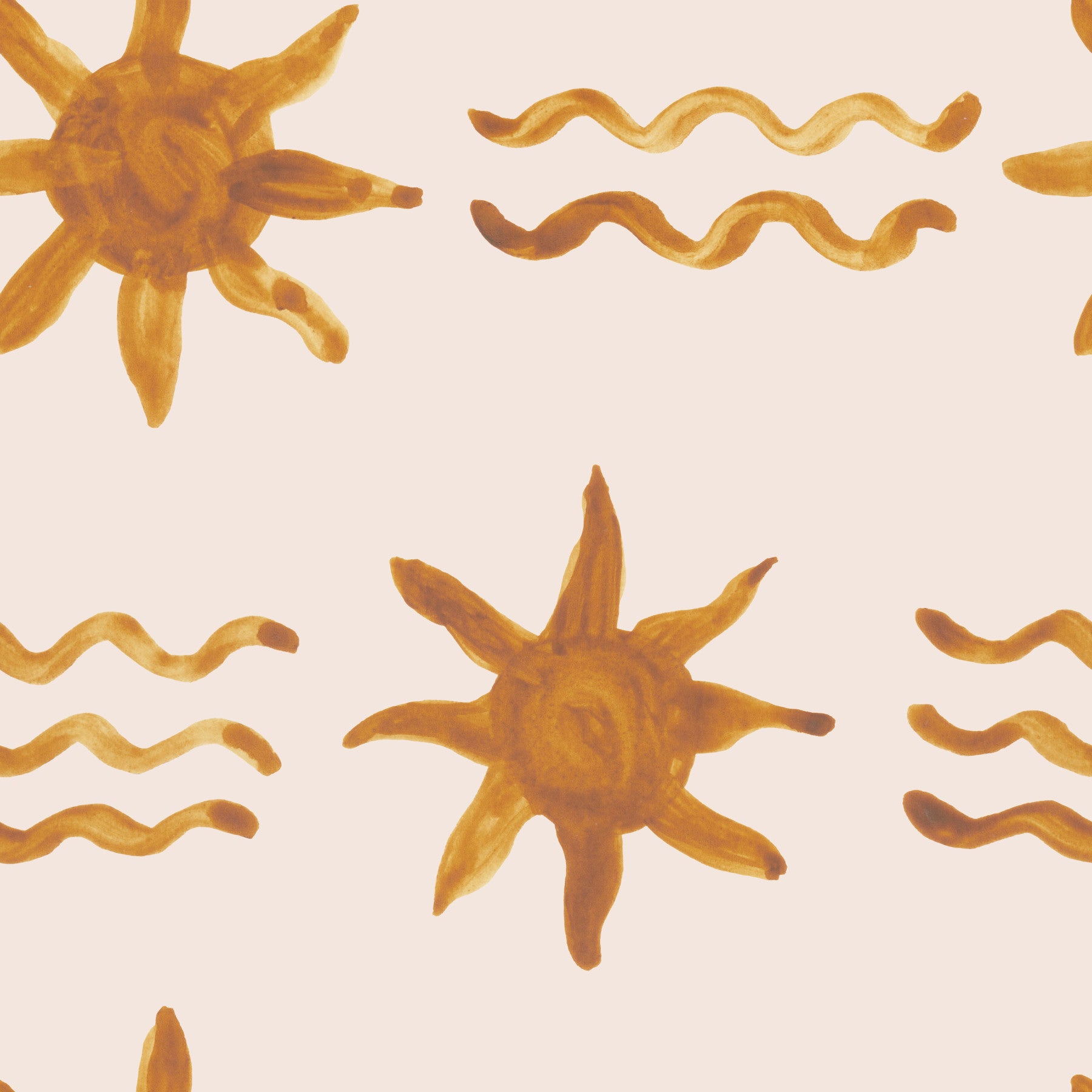 Bring a touch of sunshine to your space with this inviting design. This features a seamless pattern of golden suns and wavy lines painted in a soft brushstroke style against a calming beige backdrop. The earthy tones lend a relaxing and inviting feel, ideal for living rooms, bedrooms, or even a home office. Install this wallpaper for walls to create a space that is both modern and comforting. It complements a variety of interiors from minimalist to boho-chic, adding warmth and subtle pattern.