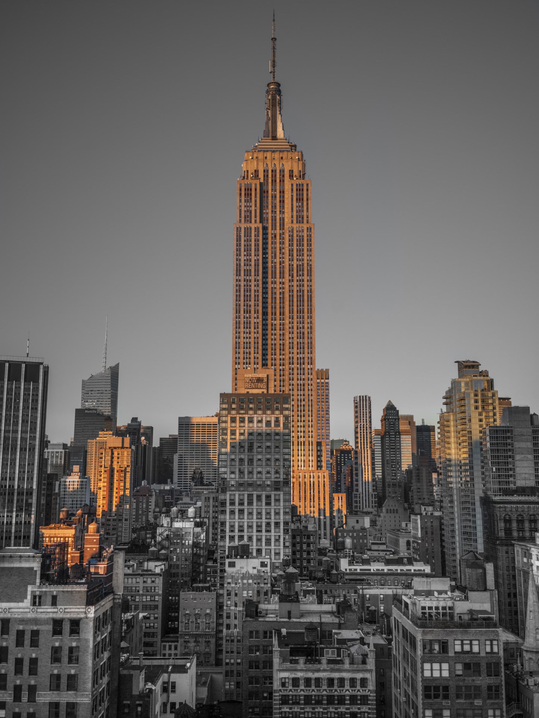 Empire State Building with New York City Manhattan skyline with skyscrapers. Introduce a touch of big-city glamour with this arresting cityscape featuring the Empire State Building. This wallpaper for walls uses selective colourisation to highlight the iconic building in radiant gold, contrasting against a muted, greyscale background. This design instantly infuses personality and intrigue into spaces. The warmth of the Empire State Building provides a comforting and stylish touch. Perfect for an entryway, bedroom, or study. Its striking contrast makes it pair effortlessly with modern furnishings. Bring New York's magic into your home with this unique vista.