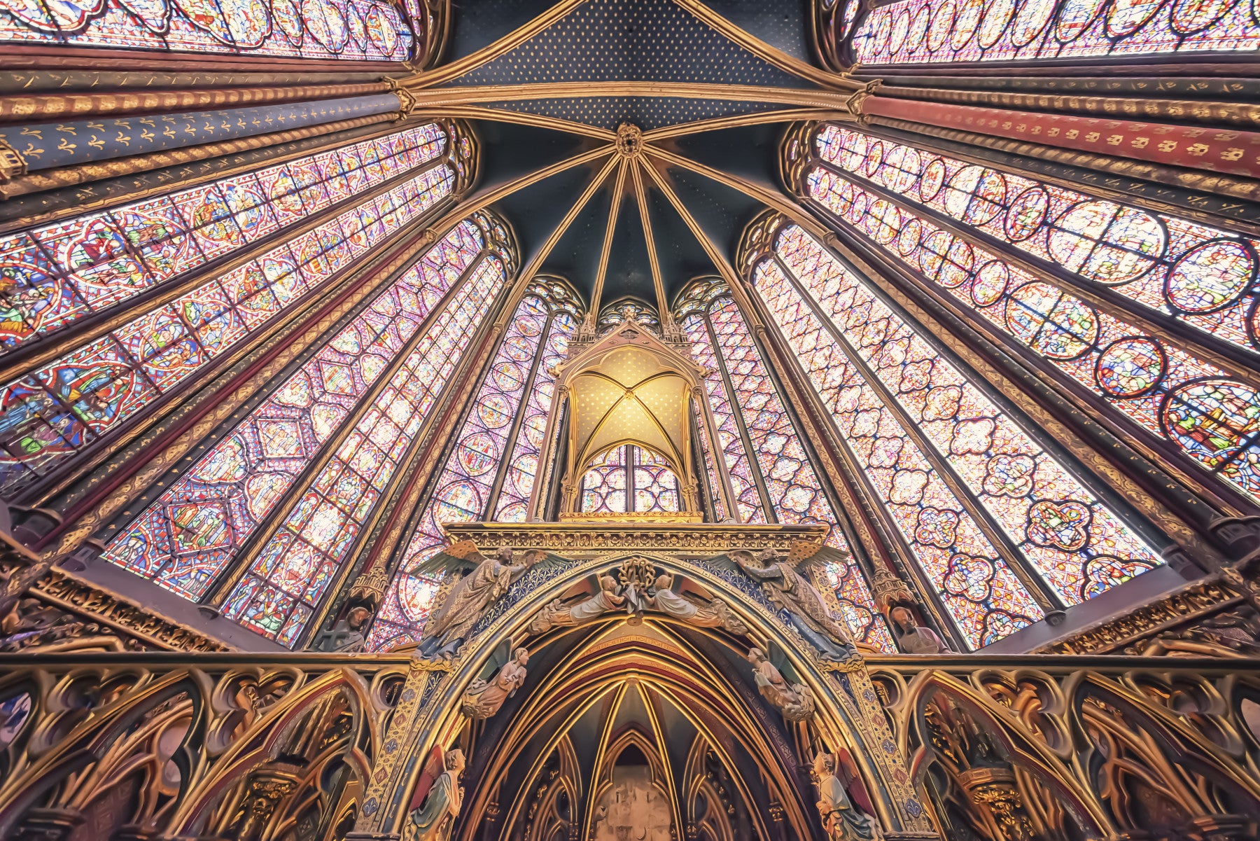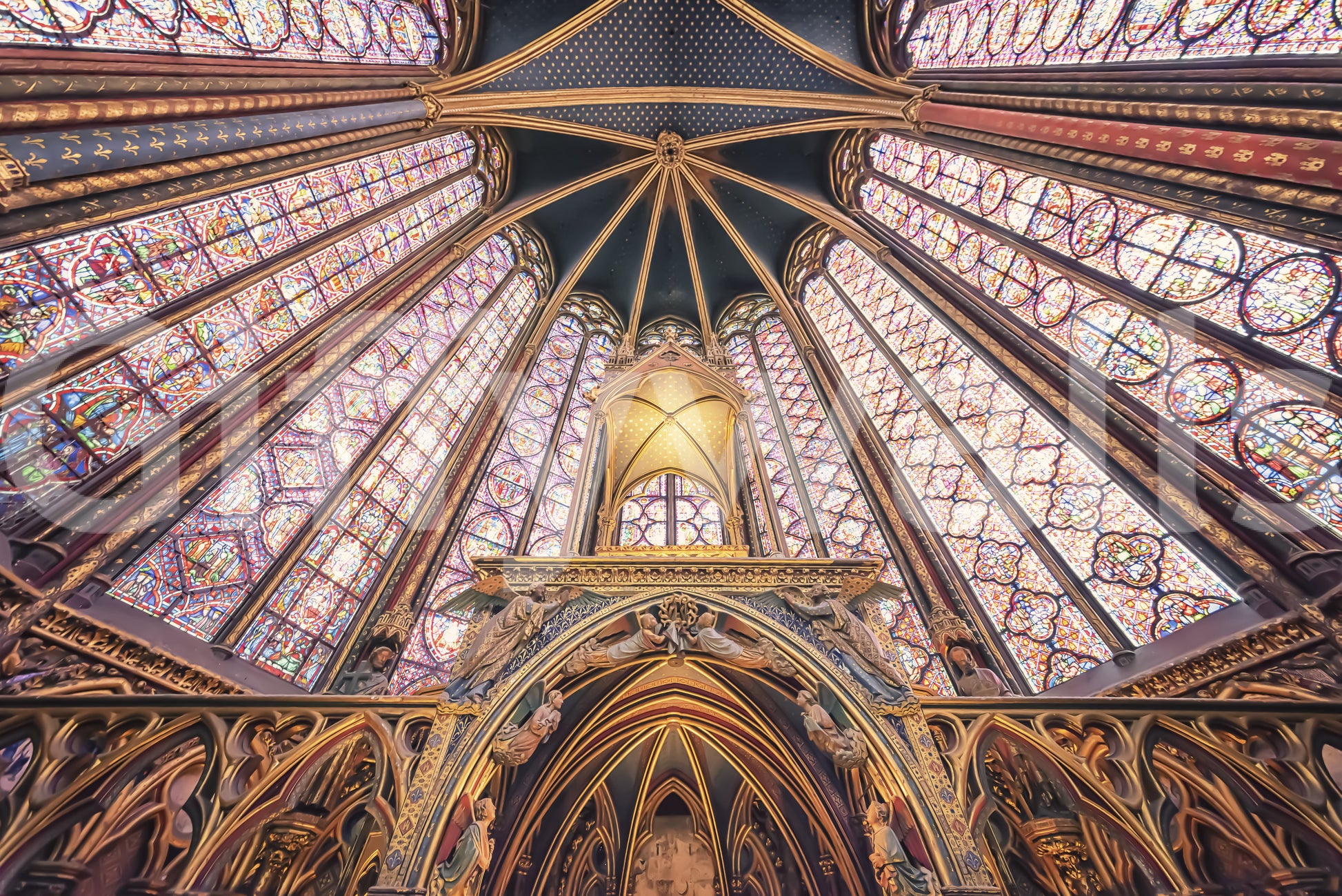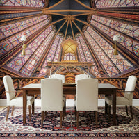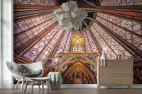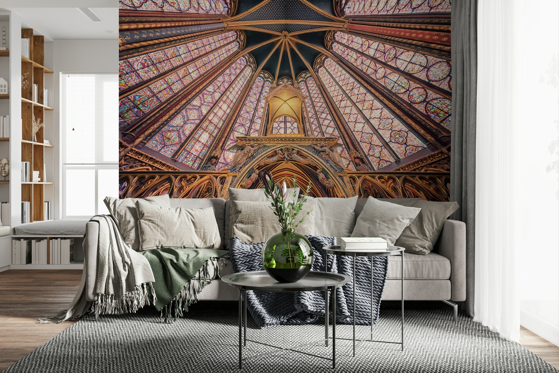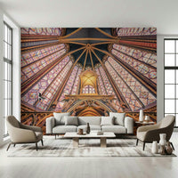 Envelop your space with a stunning portrayal of Gothic architecture. This wallpaper features a detailed view of stained glass windows and ornate carvings. The colours blend rose, azure, and gold, casting a warm light. Imagine this wallpaper for walls enhancing a dining room or creating a unique home office space. The design creates a sense of height and grandeur, making it ideal for rooms that need a focal point. Its detailed style complements both modern and classic furniture.