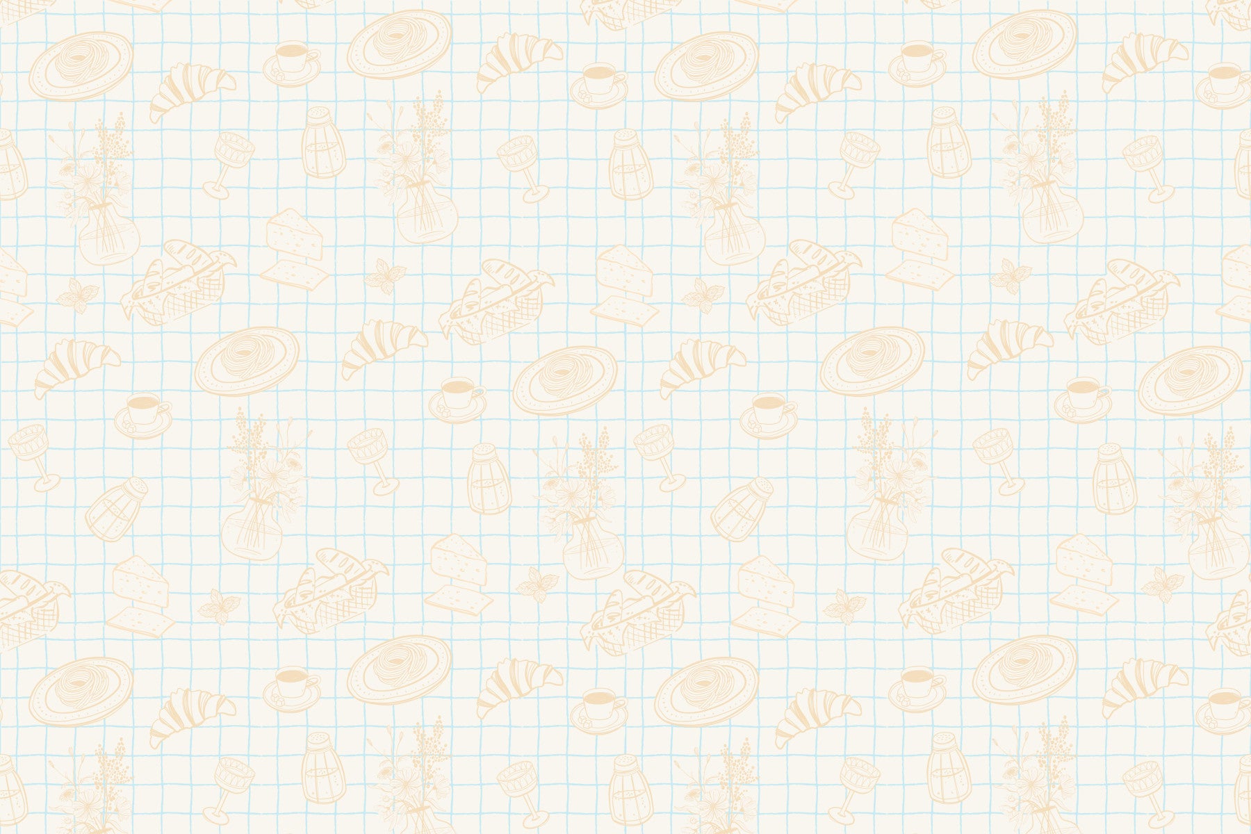 The design features a repeating pattern of soft, delicate food and drink shapes.