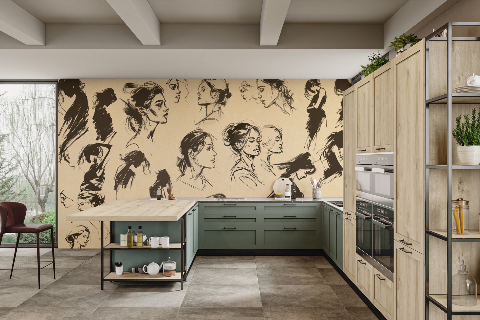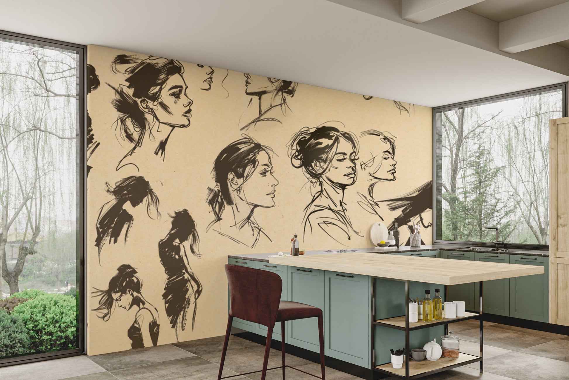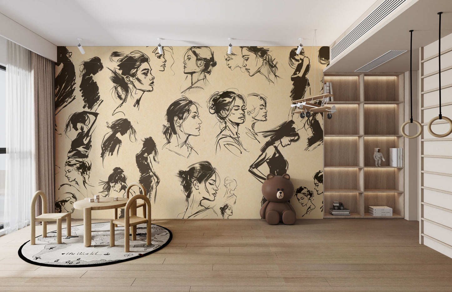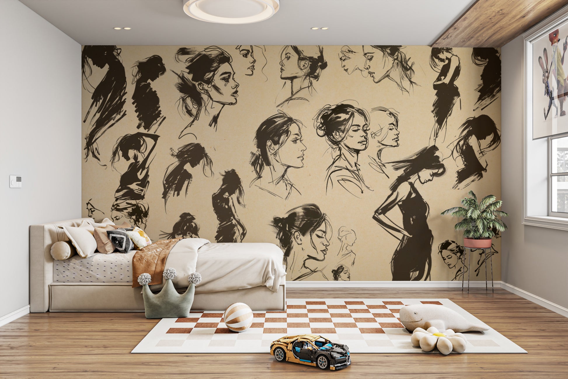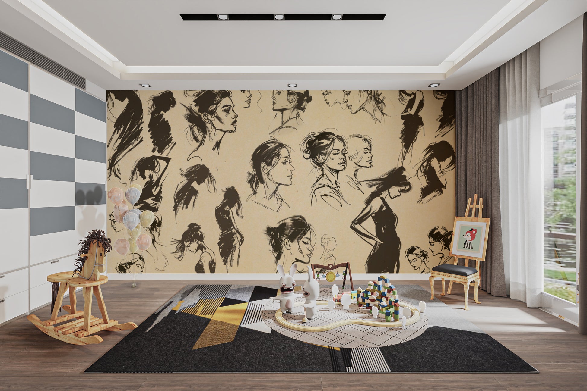 Grace in Black wallpaper adds a touch of artistry to your pleasure. Gracefully merging the charm and expression, this design features delicate ink sketches of female silhouettes in motion and emotion embellished with bold strokes and fine-line detailing. The monochrome art against a neutral backdrop creates a modern, yet sophisticated look these days, effortlessly fits into modern interiors, studios, or creative spaces. Whichever way this wallpaper joins in, be it that of an elegant living room or inspiring the energy of creativity within your walls-therefore one will obtain a graceful statement with depth and ageless charm. Welcome this unusual statement piece that manifests beauty and deftness of artistry into your décor.