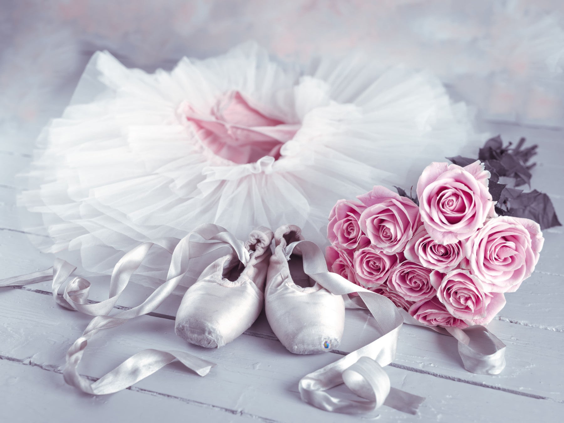 This Graceful Ballet Still Life with Roses Wall Mural features a delicate arrangement of dance essentials and fresh blooms. A soft white tulle tutu and pale satin pointe shoes with flowing ribbons rest on a rustic wooden floor, paired with a lush bouquet of pink roses. The muted, airy palette creates a serene and feminine atmosphere, making it a beautiful choice for a dreamy bedroom or dance studio.