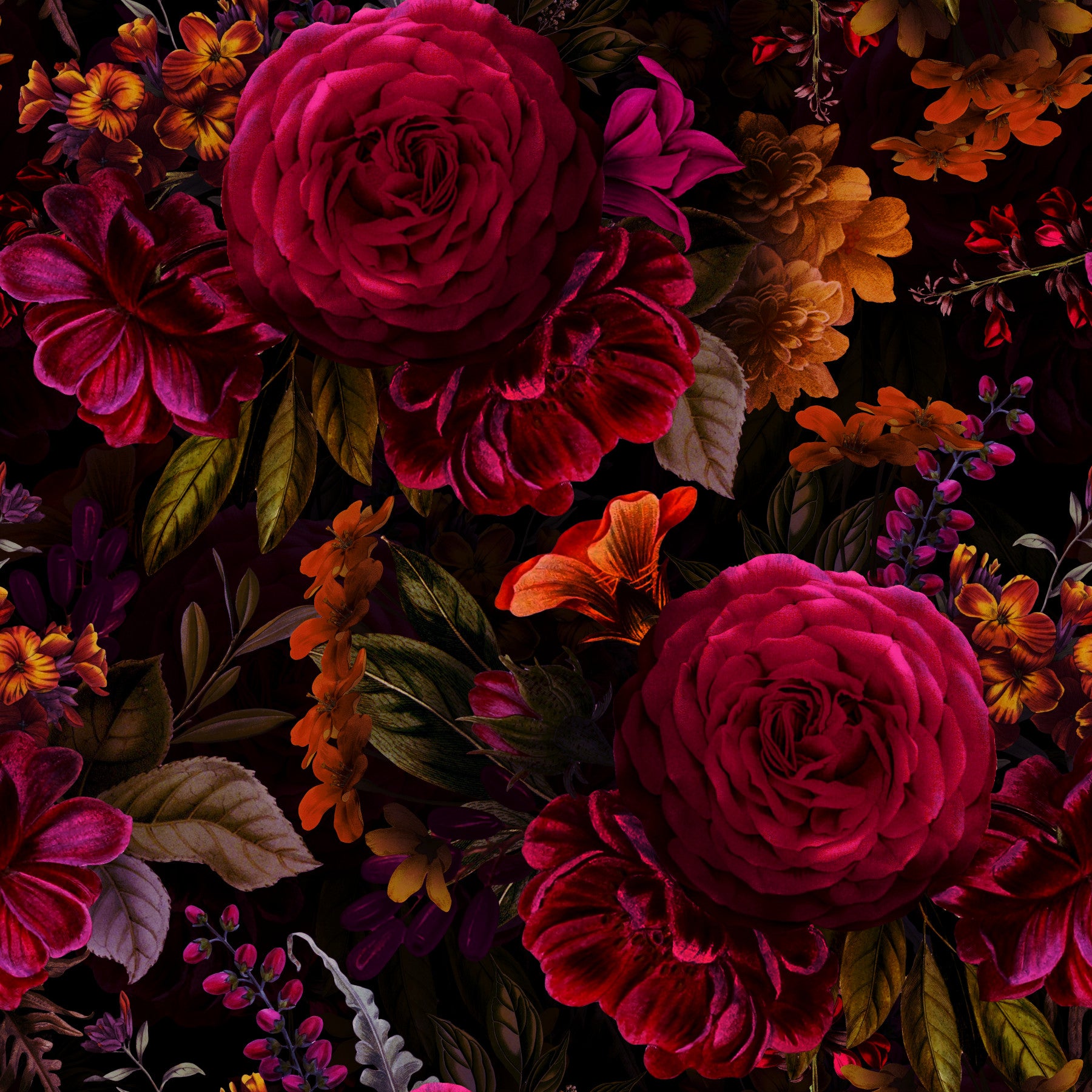Indulge in the opulent drama of 'Grandmillennial Dramatic Glamour Heritage Gothic Dark Moody Florals 7'. This wallpaper showcases a breathtaking tapestry of rich, crimson roses and autumnal blooms, rendered in a darkly romantic style. Intricate details and deep shadows evoke a sense of gothic heritage, while the luxurious textures and vibrant color palette add a touch of grandmillennial glamour. The moody, almost nocturnal atmosphere creates an air of sophisticated mystery, perfect for adding a touch of captivating elegance to any space. Experience the perfect blend of vintage charm and modern sophistication with this richly detailed floral masterpiece.