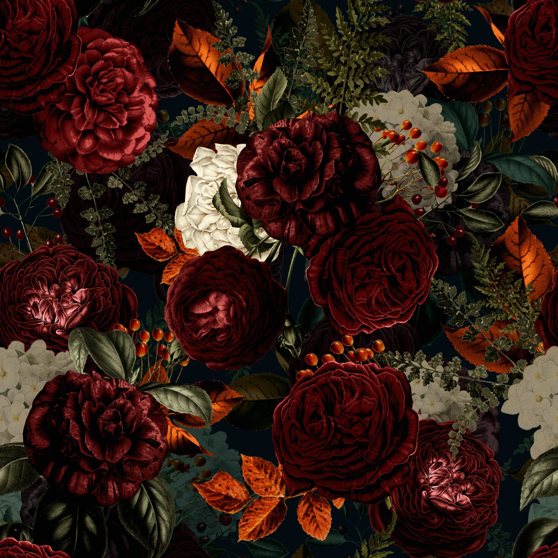 Indulge in the opulent allure of this wallpaper, a captivating blend of Grandmillennial charm and dark, moody gothic aesthetics. Rich burgundy and deep crimson roses take center stage, their velvety petals intricately detailed against a deep navy backdrop. Subtle hints of off-white hydrangeas and earthy autumnal leaves add layers of texture and depth. The overall effect is one of dramatic glamour, a heritage-inspired floral design with a touch of mysterious elegance, perfectly capturing the spirit of dark romanticism.