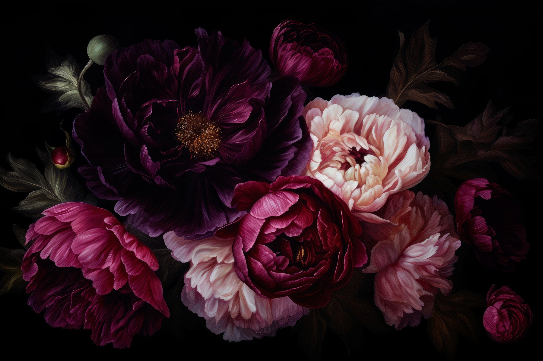 Indulge in the opulent drama of this wallpaper, a captivating blend of Grandmillennial charm and dark romanticism. Luxurious, velvety dark peonies in rich burgundy and deep purple hues take center stage, contrasted by delicate blush pink blooms. The gothic undertones, emphasized by the deep black background, create an air of sophisticated mystery. This design embodies heritage floral artistry, perfectly capturing the essence of dramatic glamour and the modern appreciation for vintage aesthetics. The meticulously rendered details of each petal bring a sense of timeless elegance to any space.