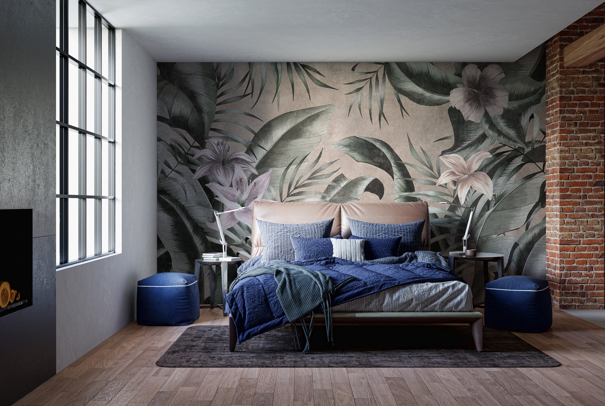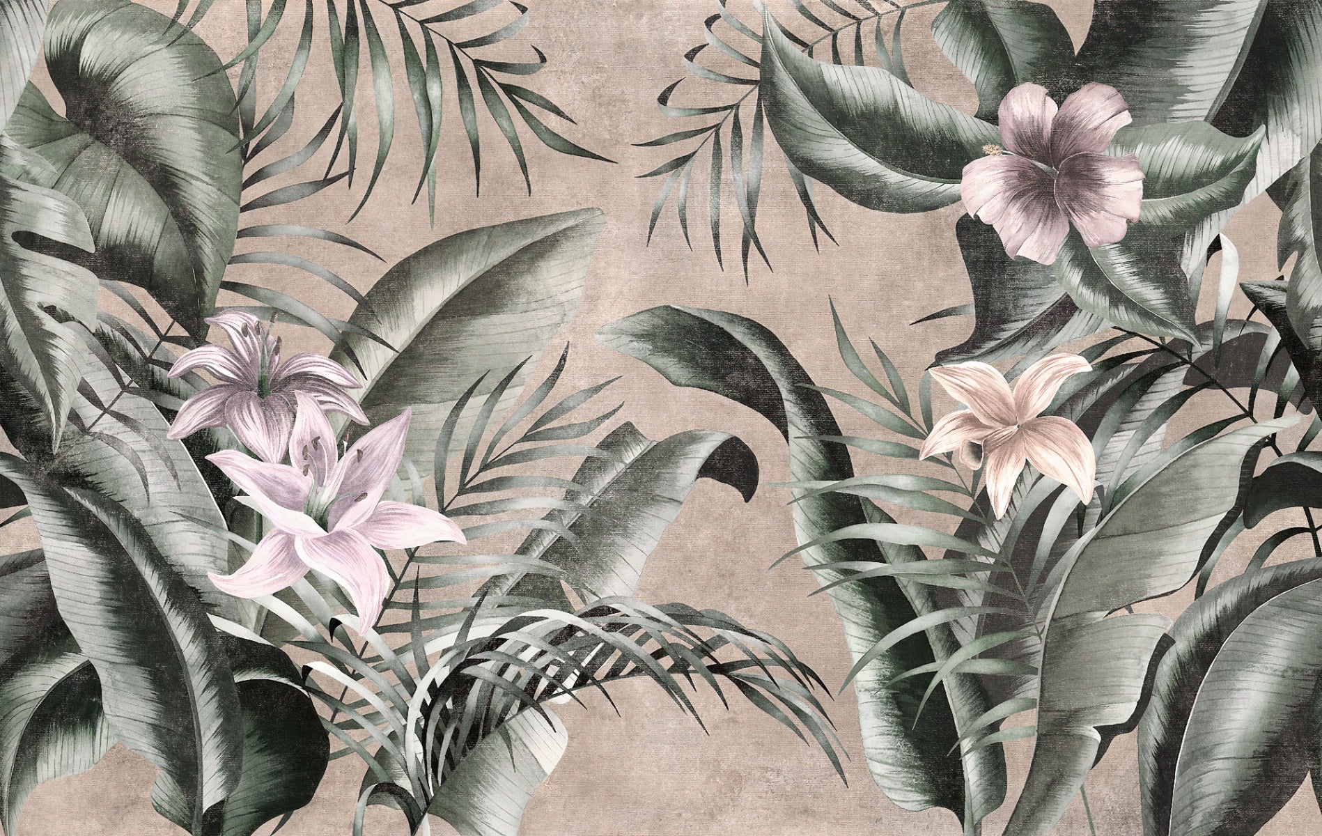 Elegant floral wallpaper mural featuring green leaves on gray.