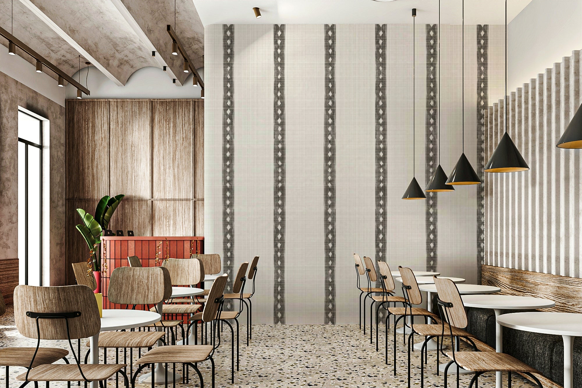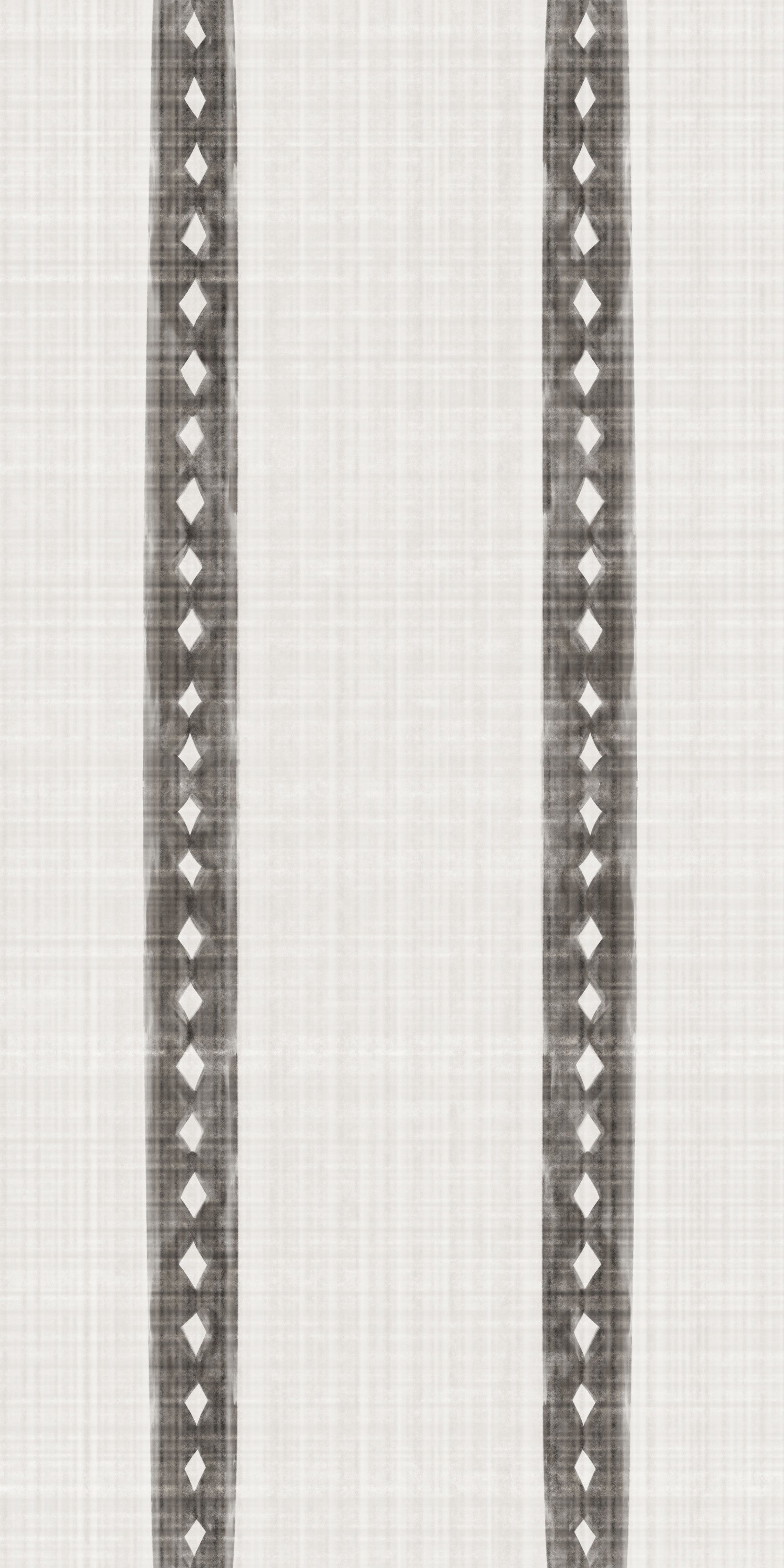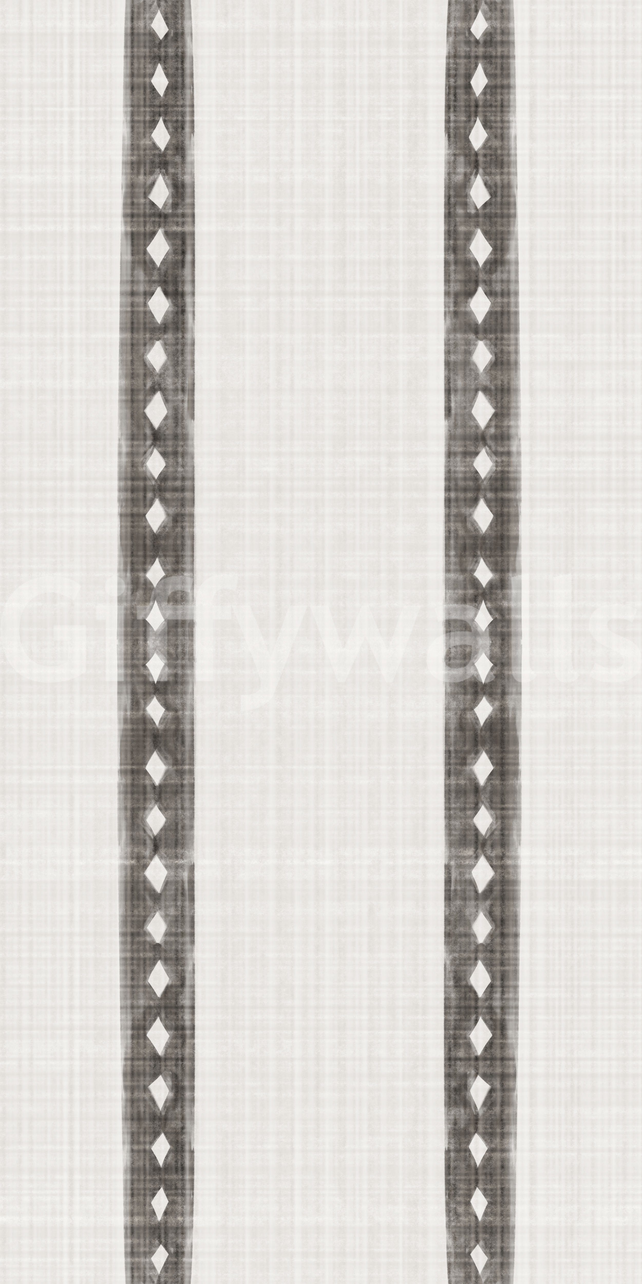 This wallpaper presents a sophisticated pattern of vertical gray stripes against a light beige linen-like background. The stripes are not solid, but feature a series of cut-out diamond shapes, creating a unique and visually appealing texture. This understated design balances simplicity with elegance and works exceptionally well in modern or contemporary spaces, adding a touch of subtle luxury without being overpowering. Its neutral tones make it a versatile choice for various rooms.