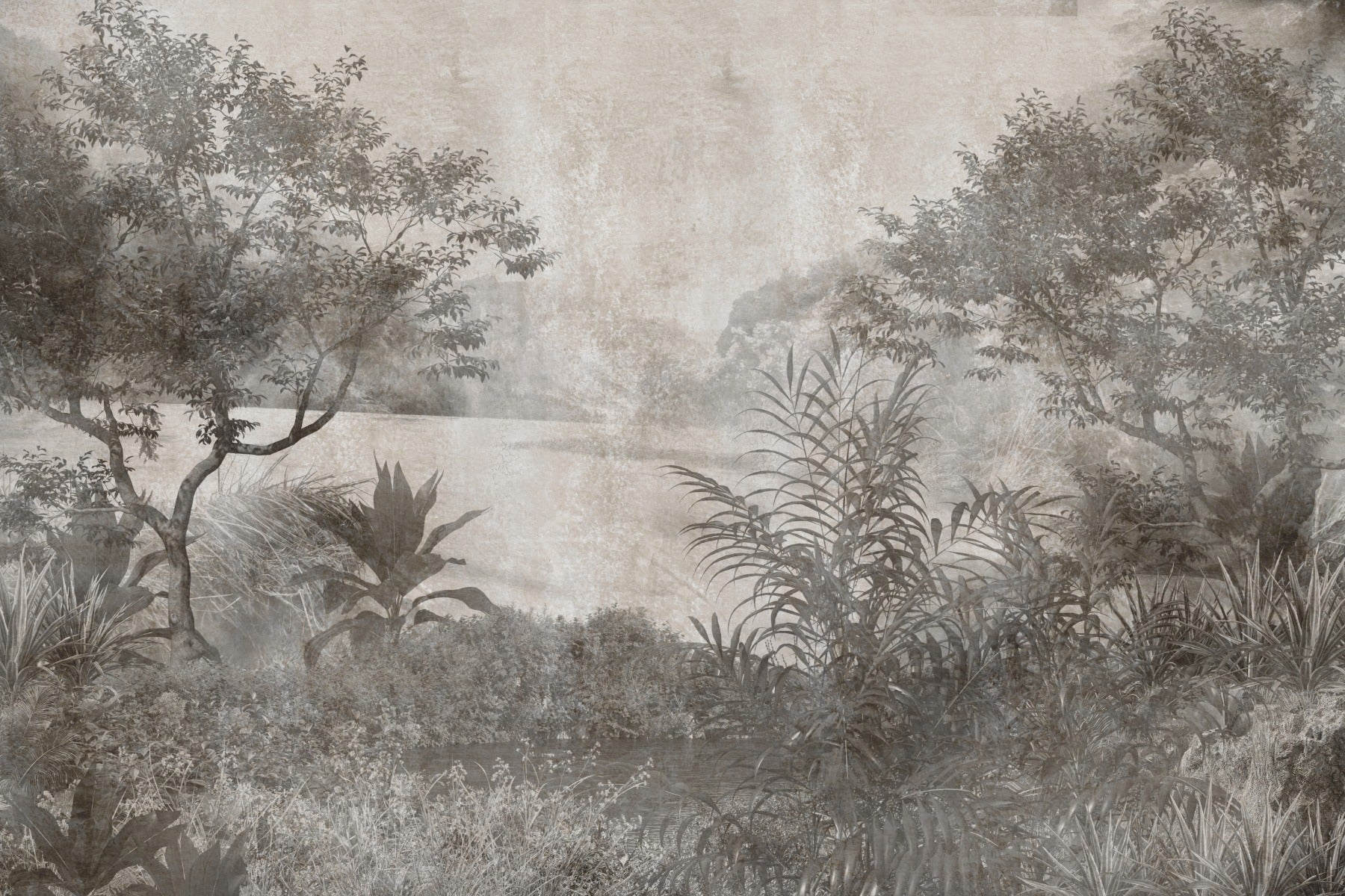Ideal for complementing with warm, earthy decor elements like wooden furniture or light-colored materials, this palm tree vintage wallpaper radiates a relaxed, organic vibe. Its neutral palette makes it versatile for various design themes.