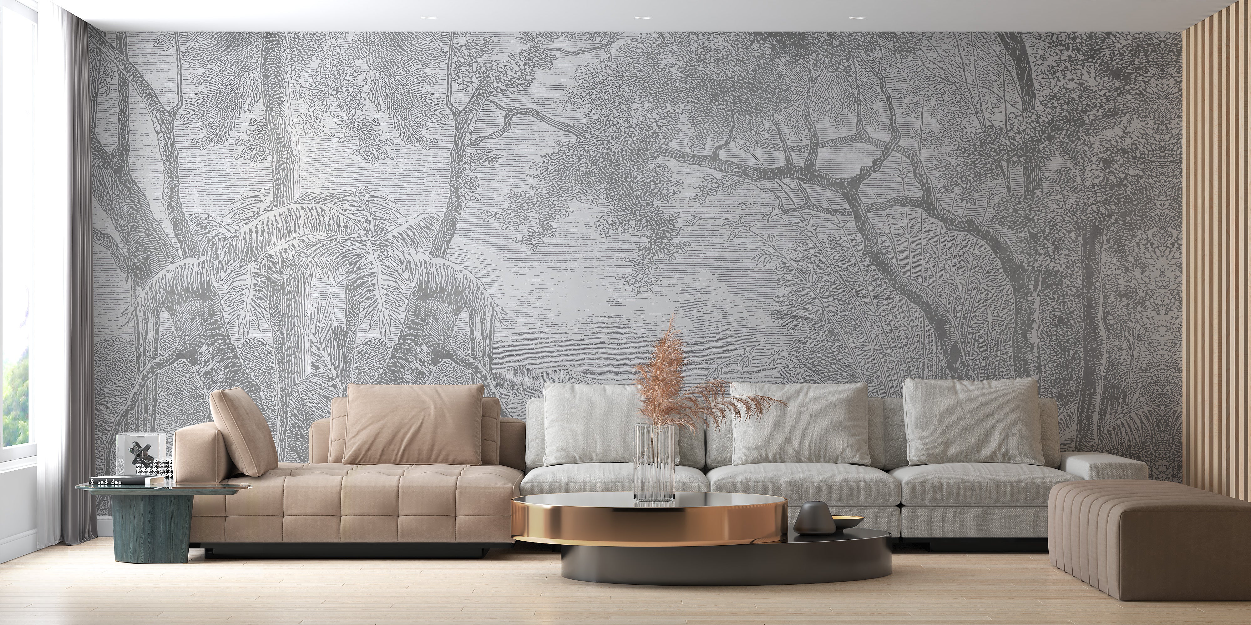 Crafted to enhance the spatial illusion of your interiors, the varying depths within the grey palette extend beyond the walls to make your living space feel more expansive and inviting. Ideal for bedrooms, dining rooms, or living areas, this sketch forest wallpaper creates an atmosphere that is both calming and invigorating.