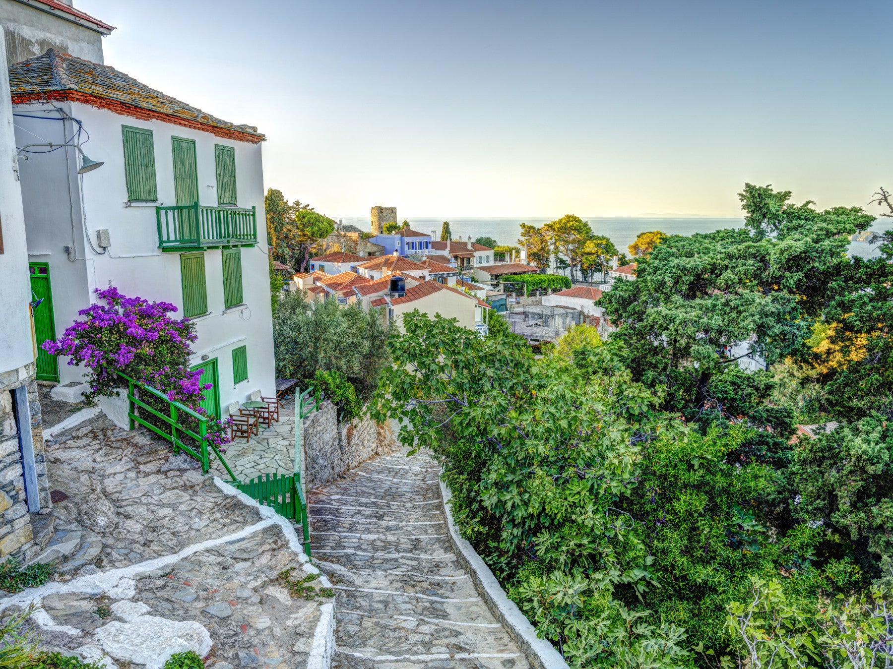 Houses on Alonissos island, Greece. Bring a touch of the Mediterranean to your home with this beautiful wallpaper for walls. The image features a charming pathway winding through a Greek island village, with classic white buildings, lush greenery, and pops of vibrant purple flowers. This design uses a calming palette of whites, greens, and purples and will create a serene and inviting atmosphere in living rooms, bedrooms, or even hallways. Its timeless style complements both modern and rustic interiors.