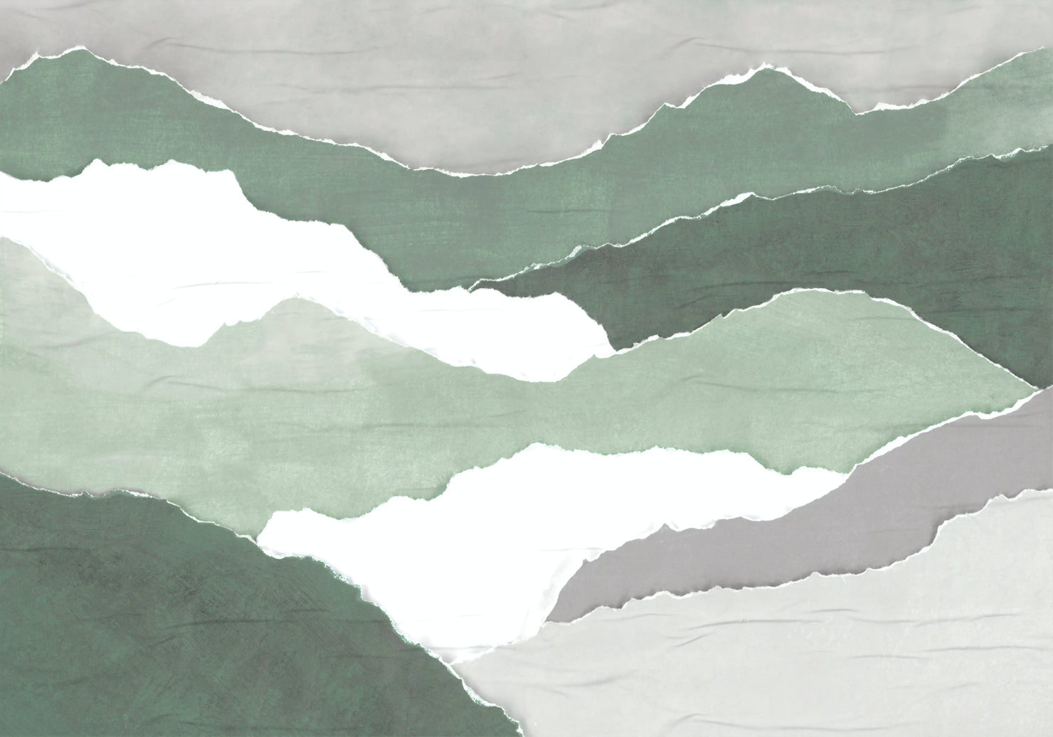 The green abstract torn paper wallpaper features layered textures and organic shapes inspired by natural landscapes. With soft shades of green, grey, and white, this nature-inspired layered mural adds depth and a calming feel to any interior. The modern mountain range wallpaper design offers a subtle yet sophisticated look, perfect for living rooms, bedrooms, or office spaces. Its earth-tone textured wall covering blends seamlessly with minimalist and contemporary styles. The torn paper effect wallpaper creates a unique visual appeal, ideal for those seeking a neutral colour abstract mural with a natural, organic touch.