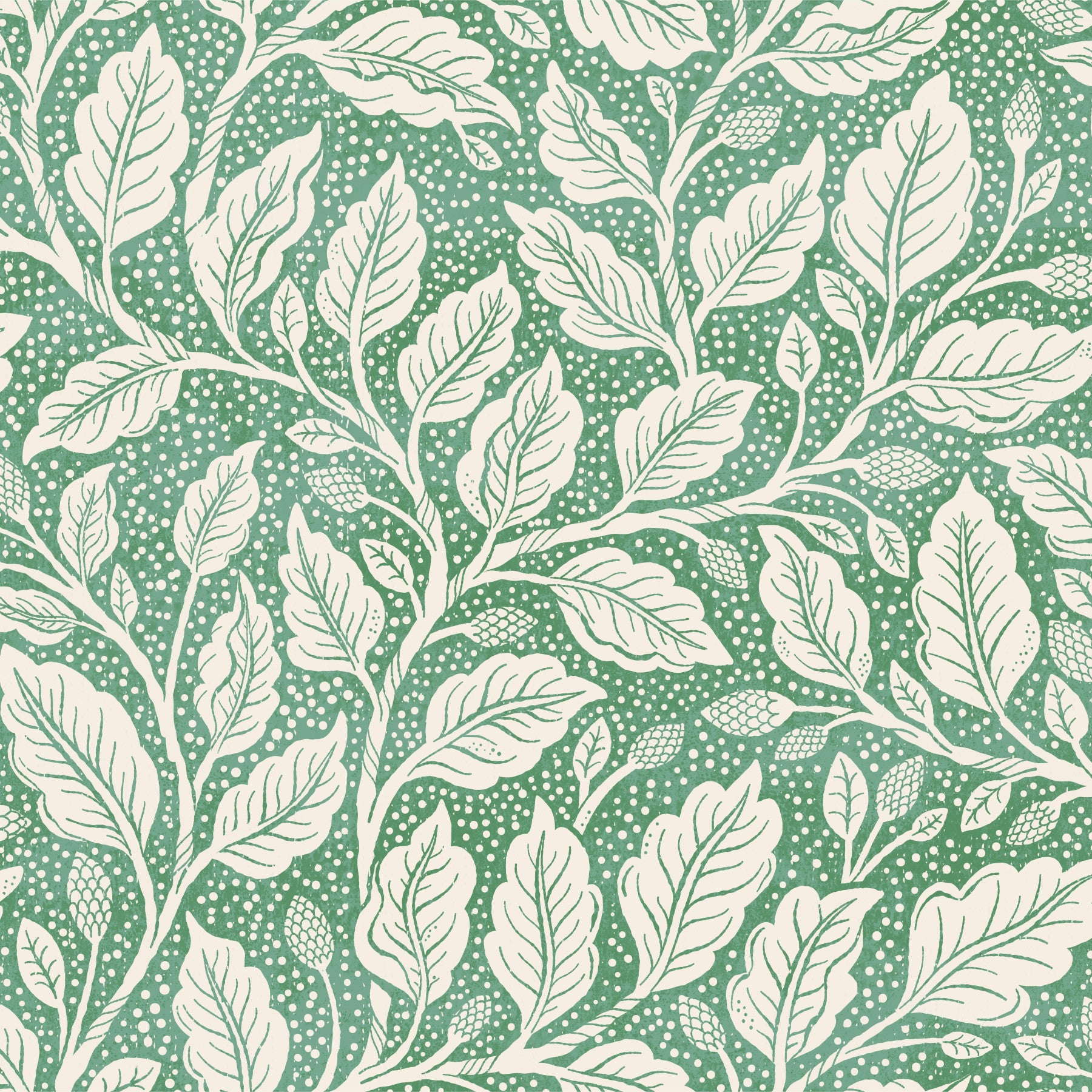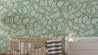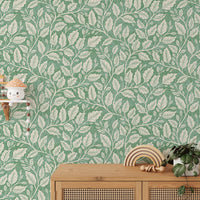Embrace the serenity of spring with "Green Budding Branches," a captivating wallpaper design. Intricate, stylized off-white leaves and budding blossoms elegantly intertwine against a soft sage green background. The textured, almost hand-printed aesthetic creates a sense of vintage charm and organic warmth. Tiny dots pepper the background, adding depth and visual interest to this sophisticated botanical pattern, perfect for creating a tranquil and inviting atmosphere in any digital space.