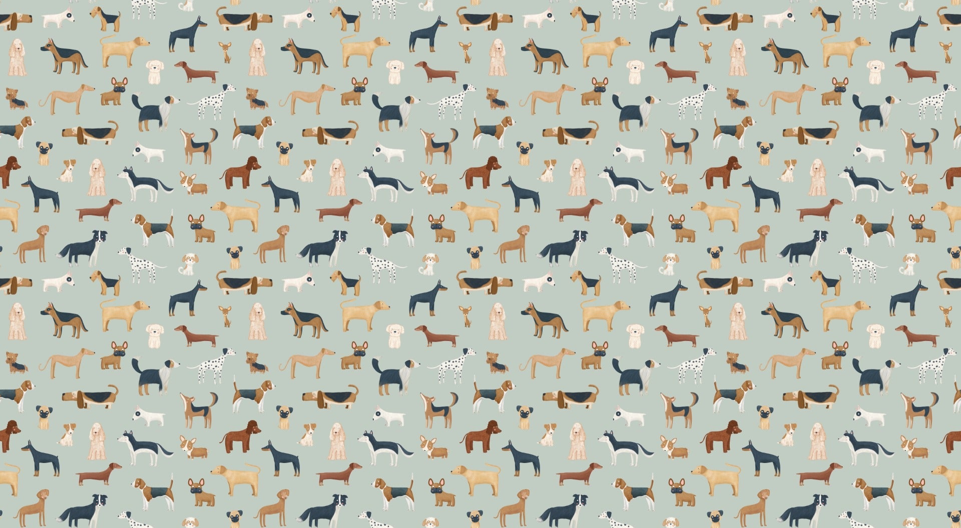 Green backdrop with various dog breeds