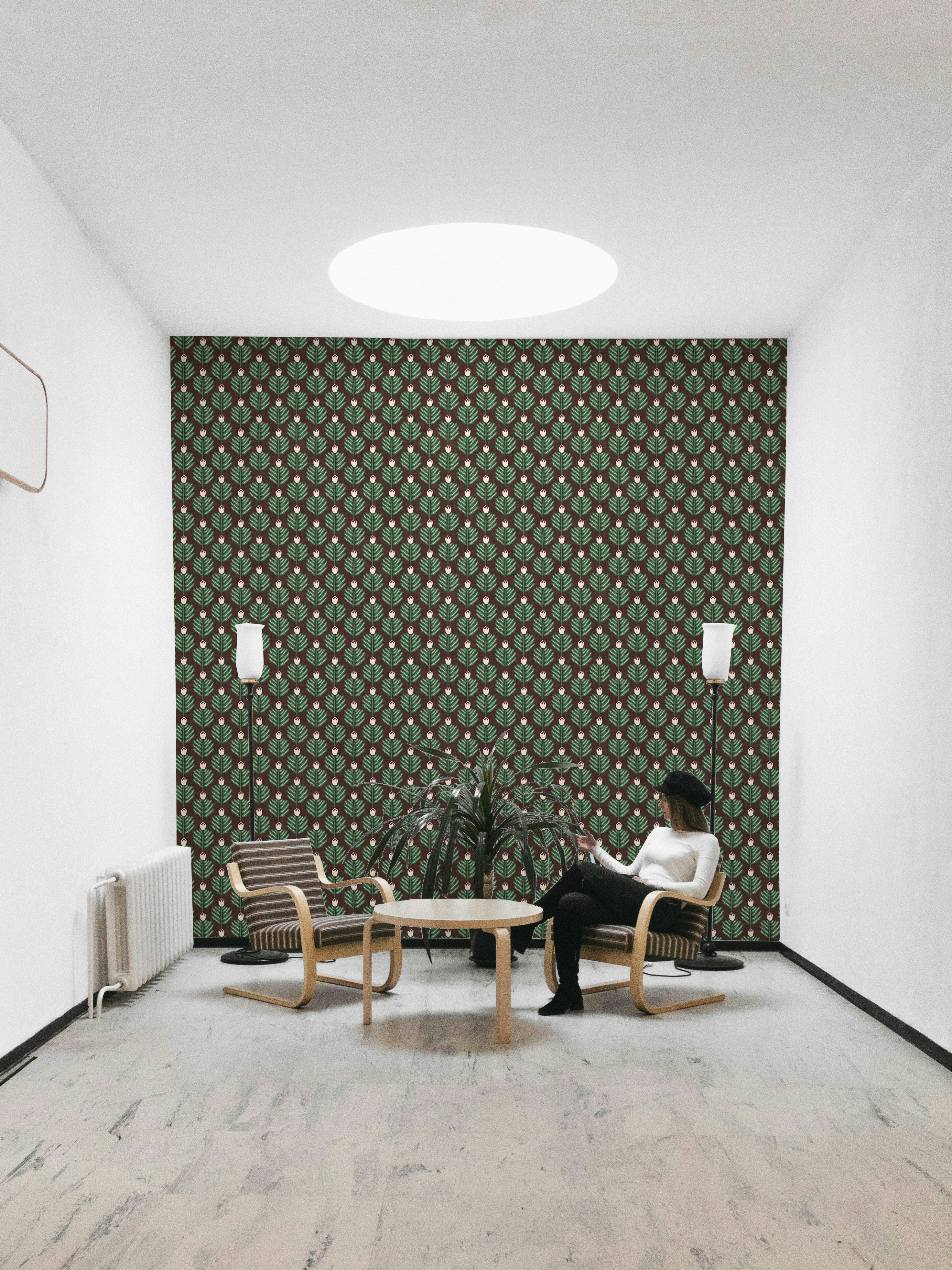 Green jungle-inspired wallpaper featuring chunky plant and jewel design