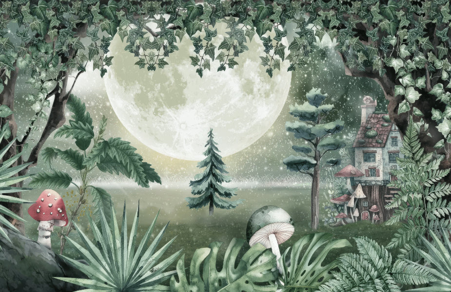 Surround your children with the lush, vibrant scenery of our kids wallpaper featuring a green magical night forest wall mural. Let them wake to the sight of towering trees and a moon that bathes their room in a gentle glow. This isn’t just a background, it's a wallpaper for their imagination. Here, fairy tales come to life, and every day is an invitation to explore a world brimming with wonder. Gift them a mural that's more than just a visual treat, it's a springboard for creativity and a haven for daydreams. Every inch is crafted to spark joy and wonder in the hearts of young explorers.