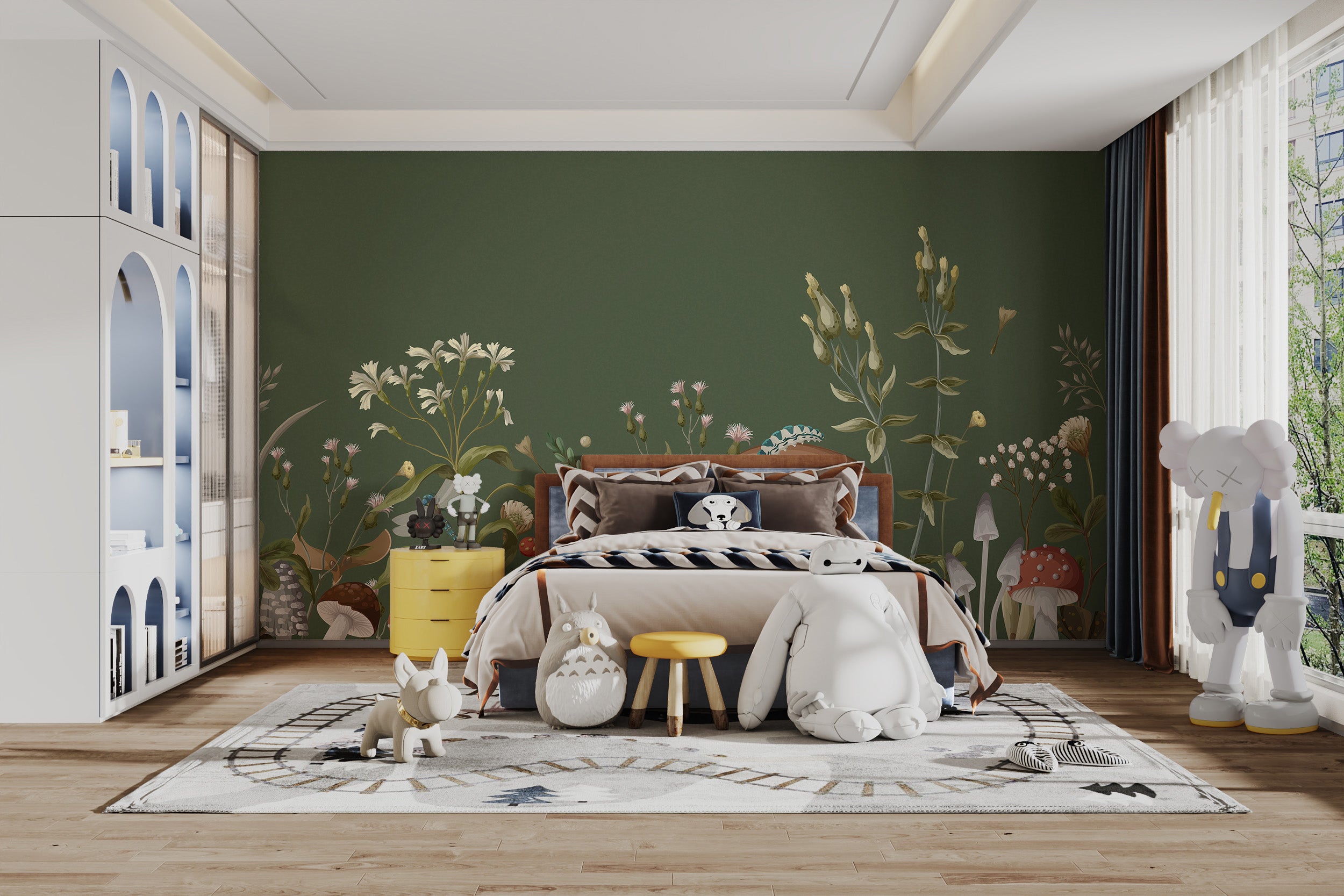 The green mushroom botanical garden wallpaper Mural brings a touch of nature's wonder into your home. Featuring detailed illustrations of mushrooms and foliage, this mural captures the essence of a lush botanical garden. The rich green background enhances the intricate designs, making each element stand out beautifully. Perfect for bedrooms, living rooms, or any space where you want to create a peaceful atmosphere. The mural is made from high-quality materials, ensuring durability and a stunning finish. Embrace the natural beauty of botanical wallpaper and transform your interiors effortlessly. Order now and enjoy a serene, nature-inspired home.