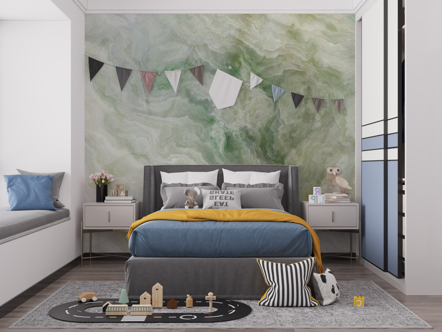 The green colour onyx marble mural wallpaper is the perfect way to add a touch of elegance to your bathroom walls. With its realistic marble design and stunning green hues, this wallpaper impresses any guest who enters your space. The high-quality materials used in this wallpaper ensure that it's durable and easy to install, so you can enjoy its beauty for years to come. With its unique combination of marble and green, this wallpaper is a perfect choice for those who want a modern and trendy look in their bathroom. Add a touch of luxury to your space with this stunning green wallpaper.