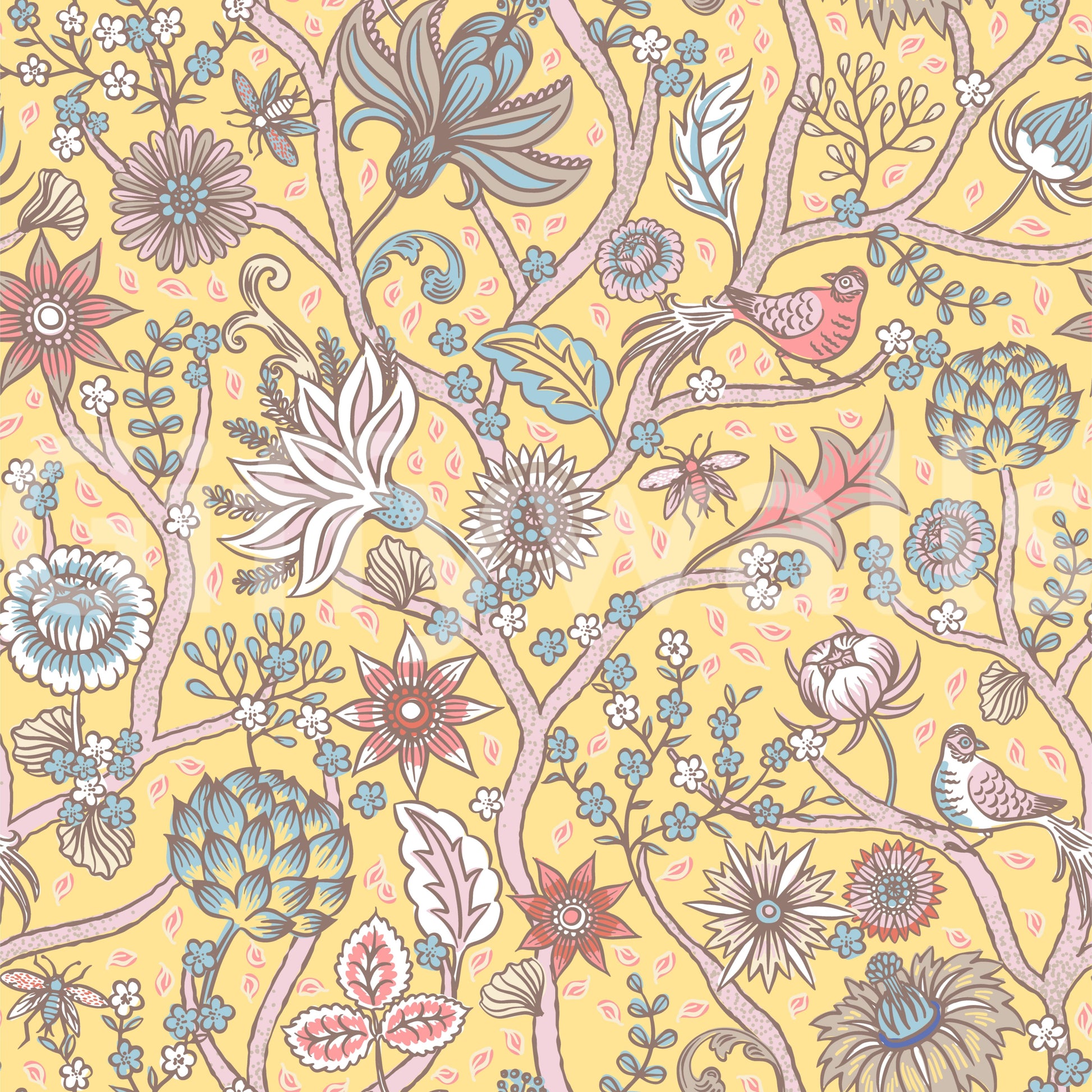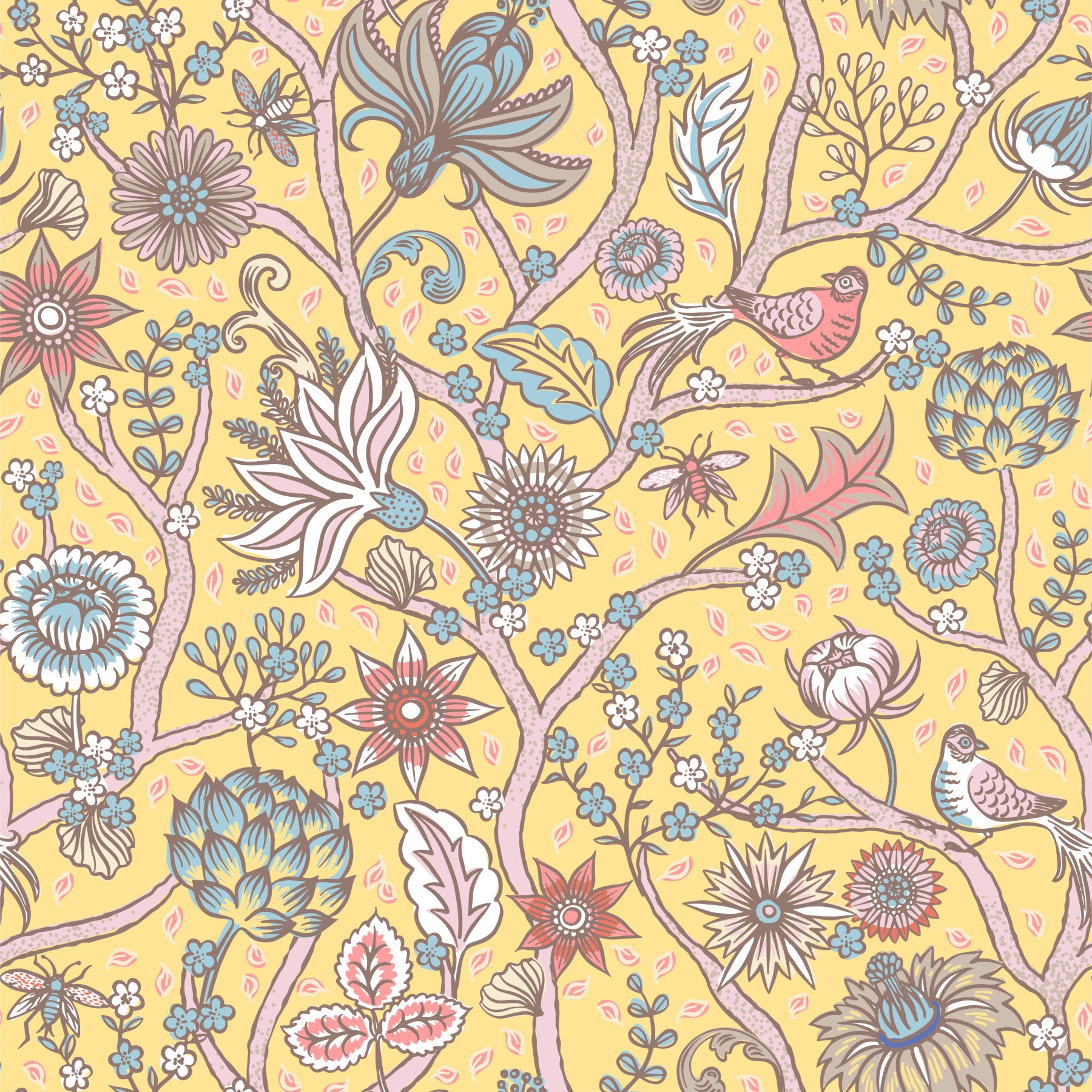 Embrace the vibrant energy of 'Green Tree of Life – Sunshine Bloom,' a captivating wallpaper design. A lush, stylized tree branches across a cheerful yellow backdrop, teeming with a profusion of pastel flowers and delicate foliage. Whimsical birds perch amongst the blossoms, adding a touch of serenity to this lively scene. Intricate details and a soft color palette create a peaceful yet cheerful atmosphere, perfect for transforming any digital space into a blooming paradise. The intricate floral patterns and delightful avian additions create a dreamy, yet refreshing aesthetic, bringing the warmth of sunshine into your digital world.