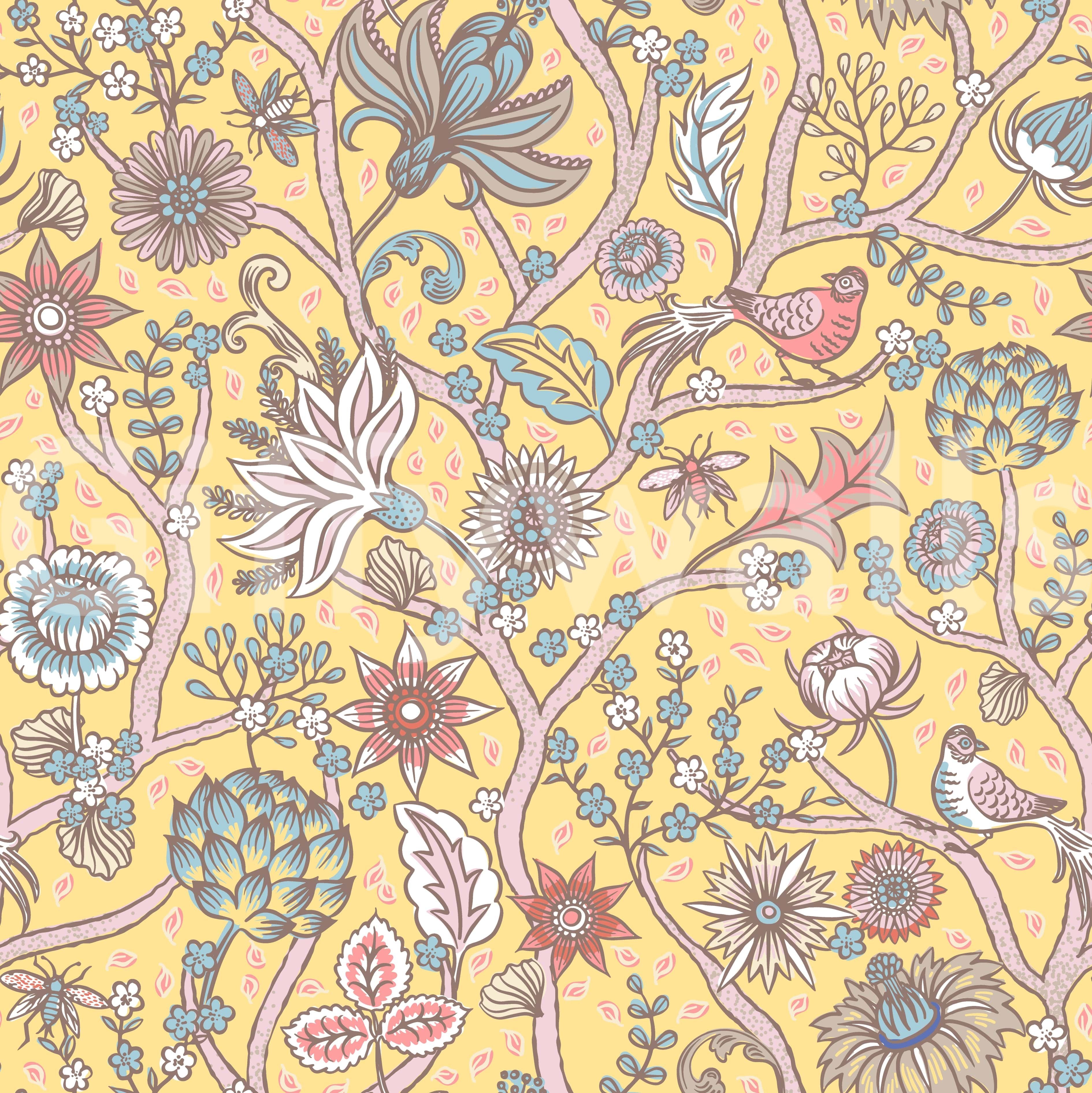 Embrace the vibrant energy of Green Tree of Life Yellow Wallpaper, a captivating wallpaper design. A whimsical, stylized tree, rendered in soft pastel greens and pinks, branches out across a sunny yellow backdrop, laden with an abundance of intricate flowers, delicate blossoms, and charming birds. The detailed floral patterns, including unique blossoms in shades of blue, pink, and cream, create a sense of lush, whimsical nature. Small, meticulously drawn insects add a touch of playful detail. This wallpaper exudes a cheerful, optimistic mood, perfect for bringing a touch of springtime elegance and joy to any space. The intricate details and soft color palette offer a harmonious blend of nature's beauty and artistic expression, making it a stunning addition to your digital collection.