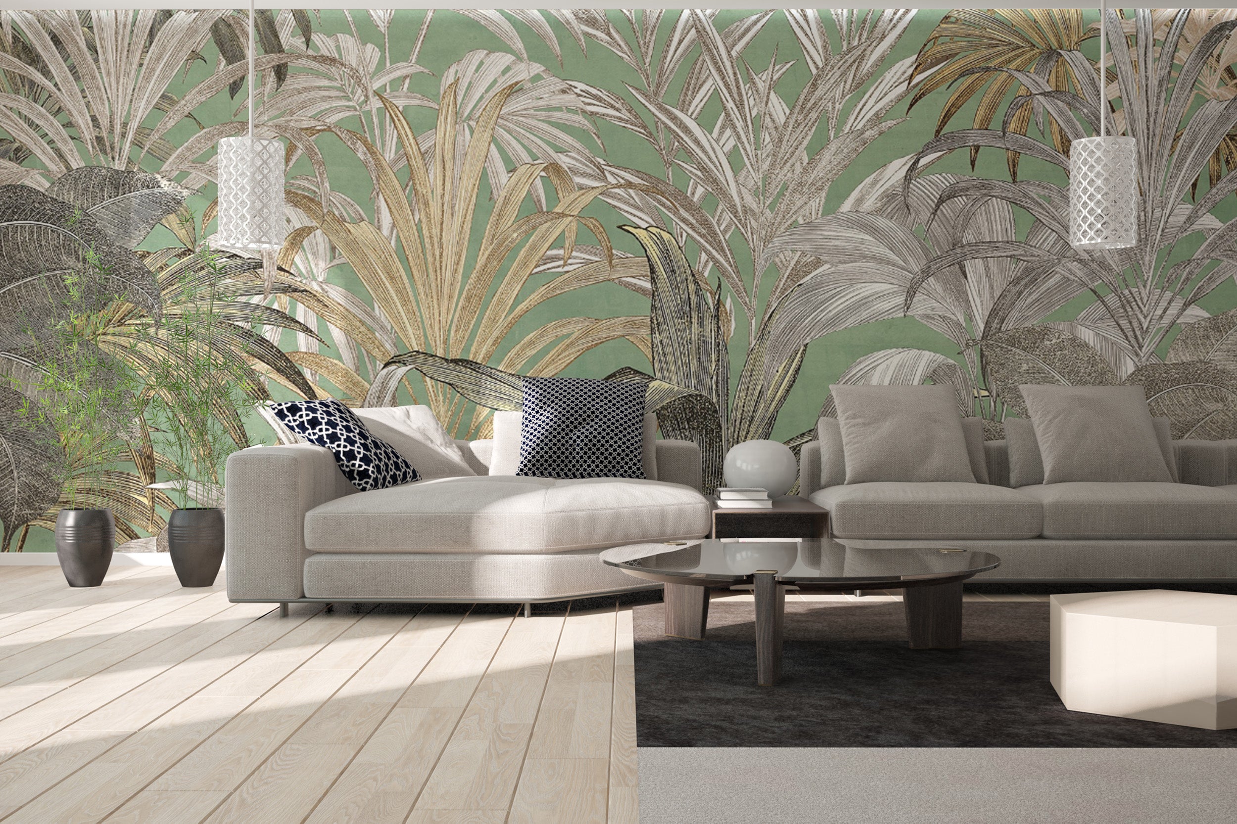 The green tropical leaf wallpaper mural brings the lush jungle beauty to your walls. This mural features intricate, hand-drawn tropical plants in rich green and gold tones and adds depth and texture to any room. The jungle foliage wallpaper design showcases layered leaves, creating a bold, vibrant backdrop perfect for living rooms, bedrooms, or offices. This green and gold botanical wallpaper's natural shades and detailed lines complement modern and traditional interiors. Let your walls reflect the wild beauty of nature with this nature-inspired tropical wallpaper, designed to refresh and energize your space.