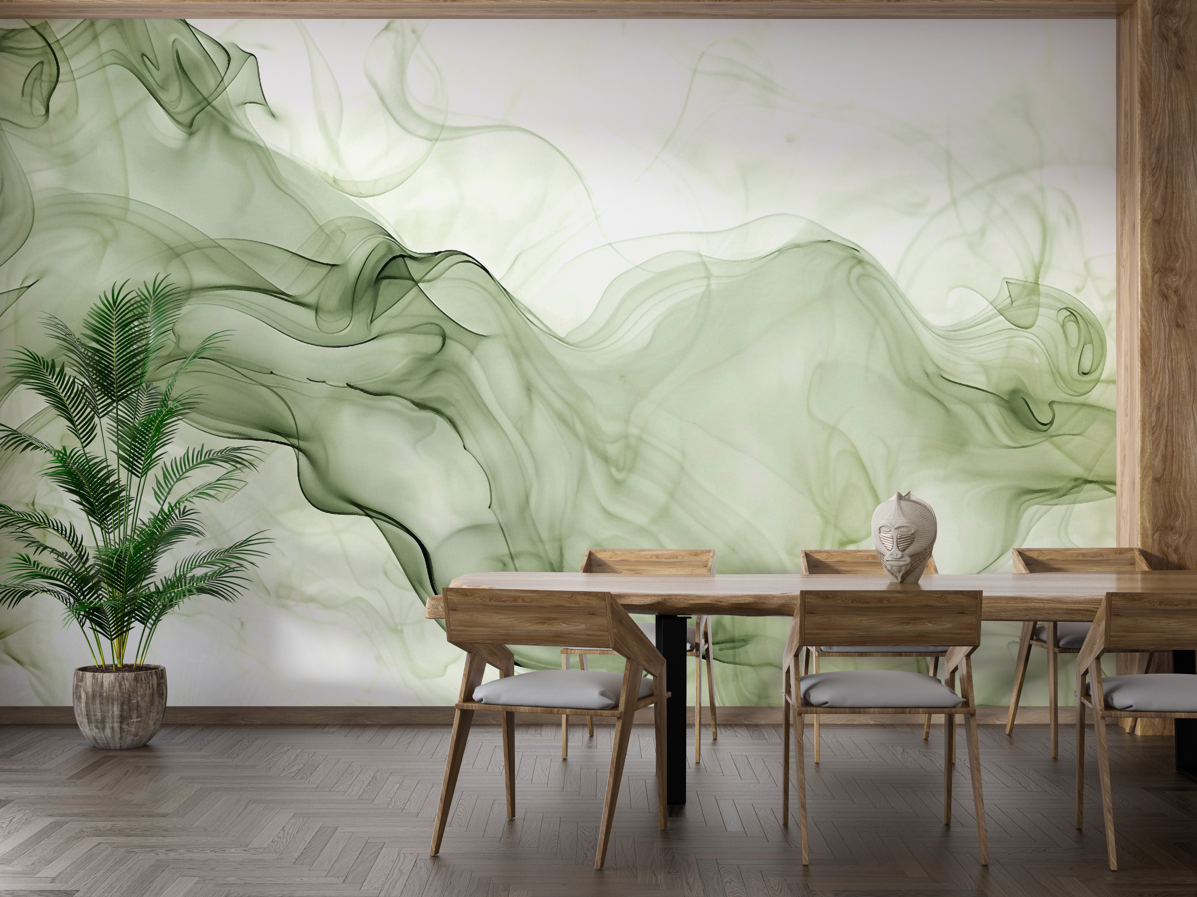 Elegant Green Watercolor Ink Mural in Living Room
