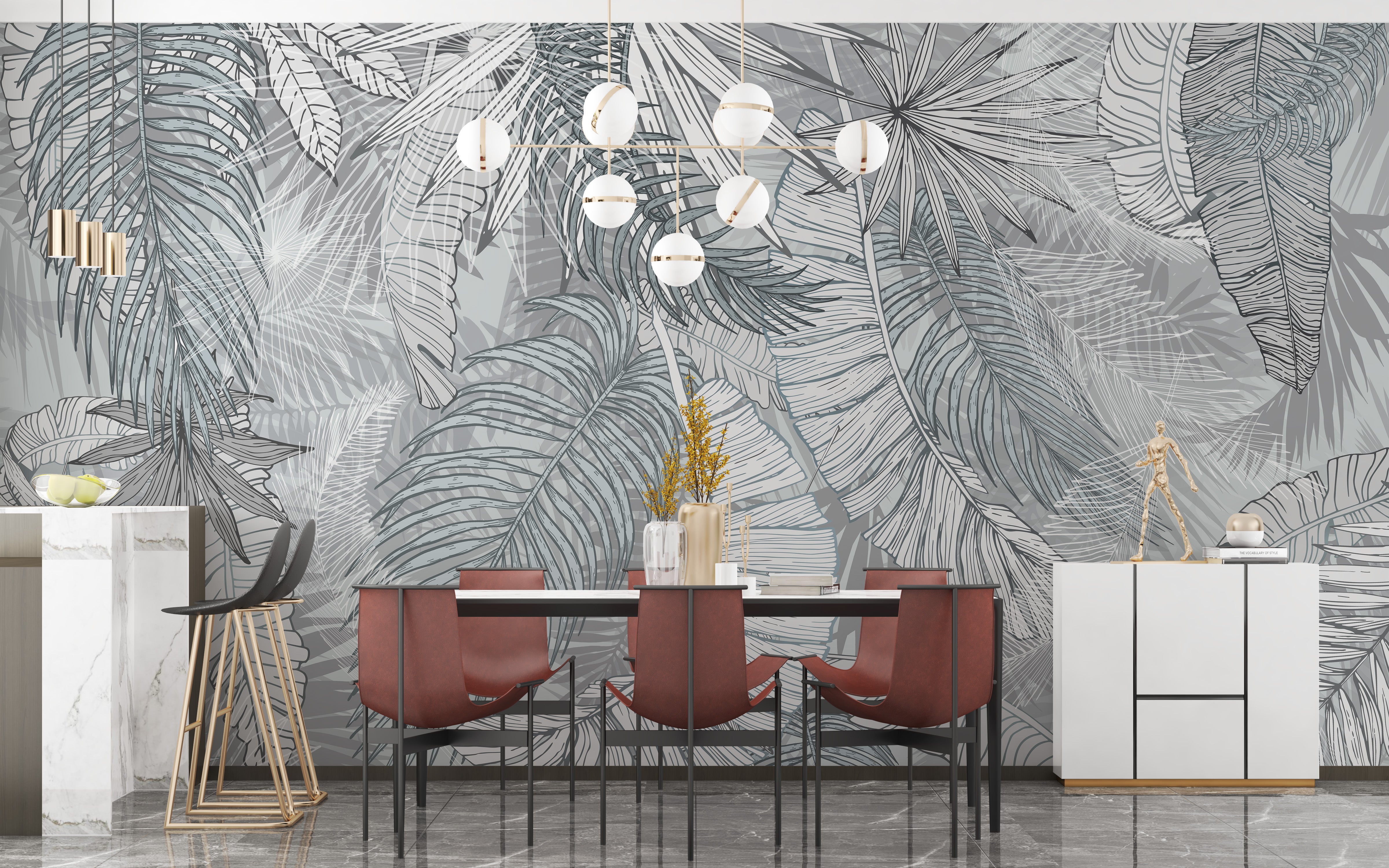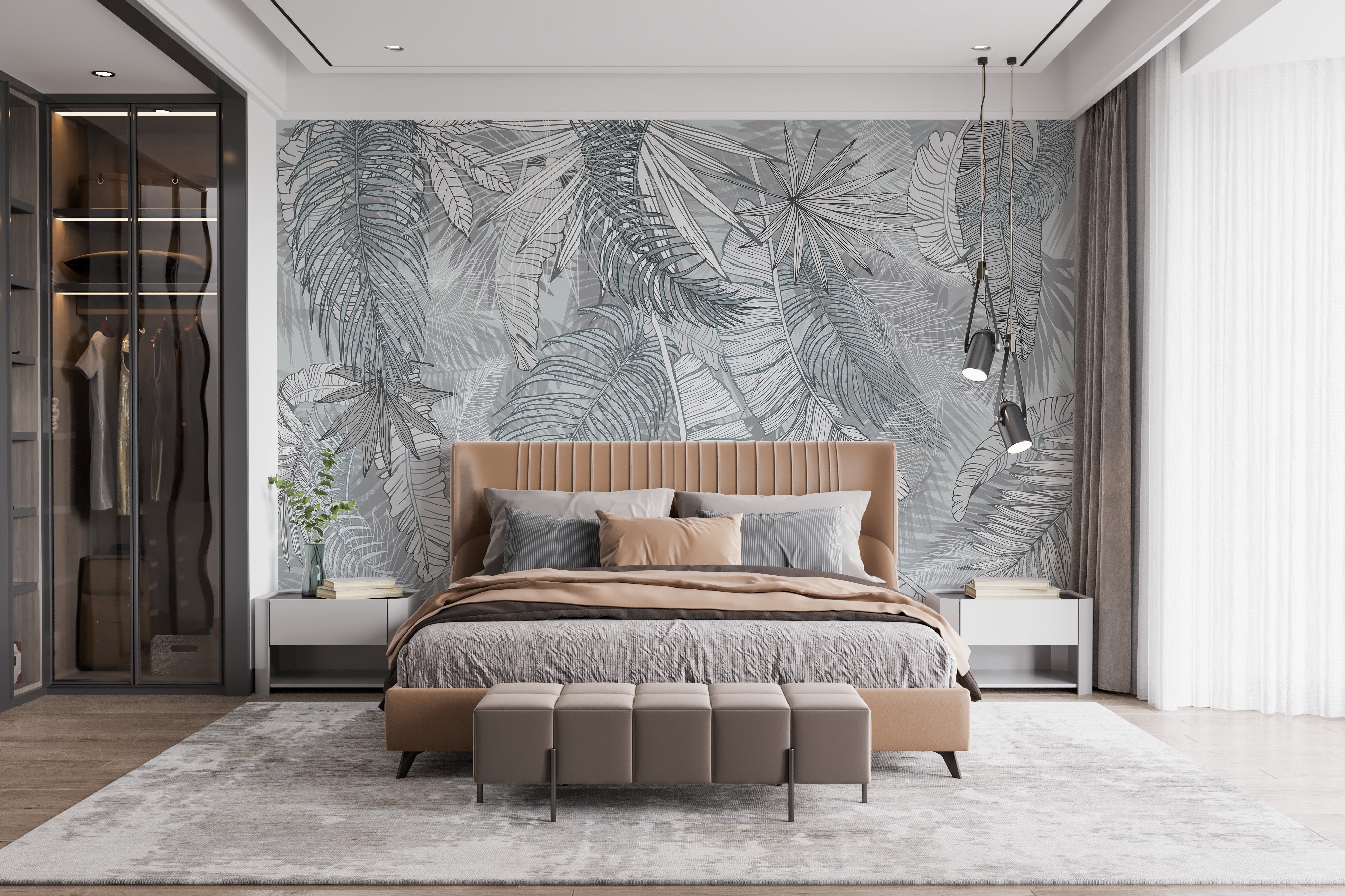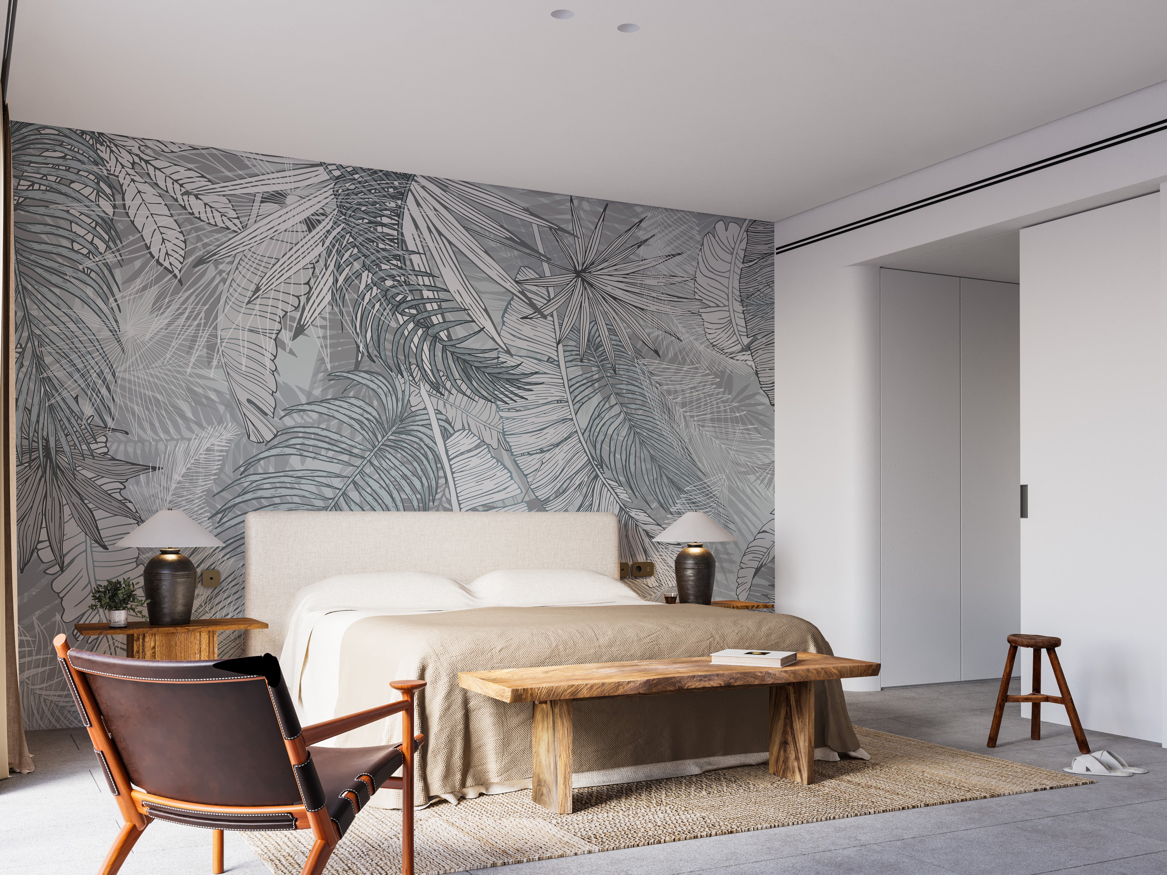 Bring a touch of the tropics to your bedroom with this stunning grey and white charcoal leafy illustrated mural wallpaper. The intricate design creates a natural atmosphere and adds a timeless touch to your space. The black and white colour scheme allows for versatility in matching any furniture or decor already in your room. With a visually striking wallpaper, there's no need for significant transformations or transportation sit back, relax, and let this wallpaper do all the work in elevating your space.