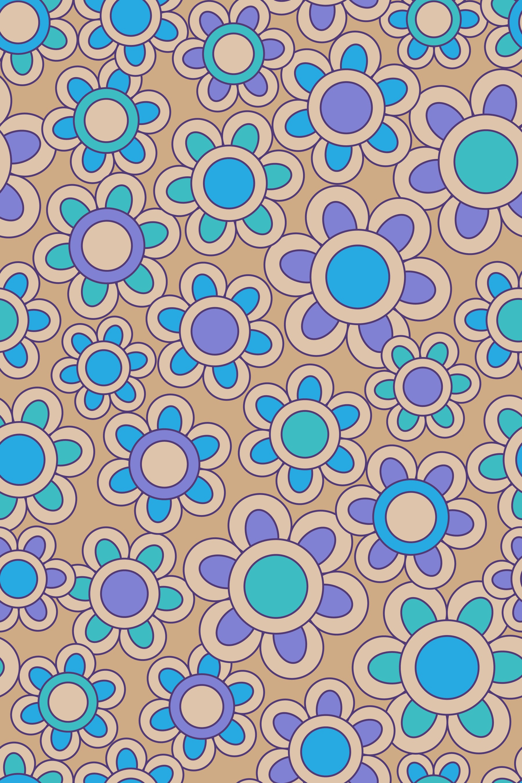 Step back in time with this bright and colourful "Groovy Daisies" wallpaper that brings the far-out vibes of the 1970s to your space! This flower design features a playful arrangement of stylised daisies in a vibrant, psychedelic colour palette of aqua turquoise, bright blue, lavender purple and cream on a warm beige backdrop. Each daisy is outlined (in purple!) for a groovy retro look. Perfect for adding a touch of nostalgia and positive energy to any space, this wallpaper is guaranteed to brighten your day and spark joy with its fun floral pattern. This pattern design is also available in Other Colourways too! Original wallpaper pattern design by Jackie Tahara of UnBlink Studio.